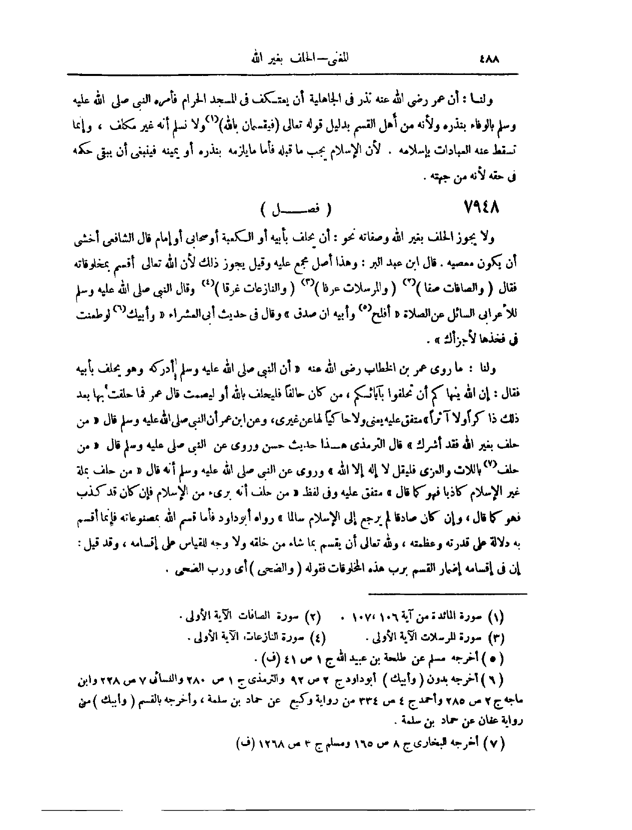 (٧٩٤٢) فَصْلٌ: وَلَا يَجُوزُ الْحَلِفُ بِغَيْرِ اللَّهِ تَعَالَى، وَصِفَاتِهِ، نَحْوَ أَنْ يَحْلِفَ بِأَبِيهِ، أَوْ الْكَعْبَةِ، أَوْ صَحَابِيٍّ، أَوْ إمَامٍ قَالَ الشَّافِعِيُّ: أَخْشَى أَنْ يَكُونَ مَعْصِيَةً. قَالَ ابْنُ عَبْدِ الْبَرِّ: وَهَذَا أَصْلُ مَجْمَعٌ عَلَيْهِ. وَقِيلَ: يَجُوزُ ذَلِكَ؛ لِأَنَّ اللَّهِ تَعَالَى أَقْسَمَ بِمَخْلُوقَاتِهِ، فَقَالَ: {وَالصَّافَّاتِ صَفًّا} [الصافات: ١] . {وَالْمُرْسَلاتِ عُرْفًا} [المرسلات: ١] . {وَالنَّازِعَاتِ غَرْقًا} [النازعات: ١] . «وَقَالَ النَّبِيُّ - صَلَّى اللَّهُ عَلَيْهِ وَسَلَّمَ - لِلْأَعْرَابِيِّ السَّائِلِ عَنْ الصَّلَاةِ: أَفْلَحَ، وَأَبِيهِ، إنْ صَدَقَ» . وَقَالَ فِي حَدِيثِ أَبِي الْعُشَرَاءِ: «وَأَبِيك لَوْ طَعَنْت فِي فَخِذِهَا لَأَجْزَأَك» .