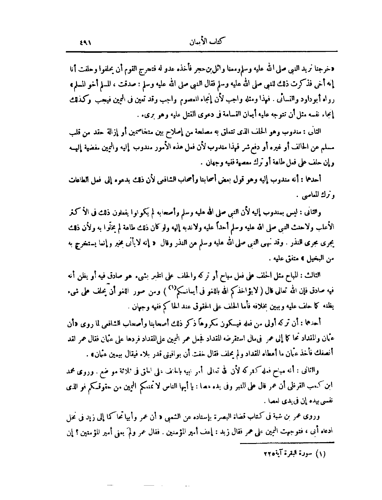 خَرَجْنَا نُرِيدُ النَّبِيَّ - صَلَّى اللَّهُ عَلَيْهِ وَسَلَّمَ - وَمَعَنَا وَائِلُ بْنُ حُجْرٍ، فَأَخَذَهُ عَدُوٌّ لَهُ، فَتَحَرَّجَ الْقَوْمُ أَنْ يَحْلِفُوا، وَحَلَفْت أَنَا أَنَّهُ أَخِي، فَذَكَرْت ذَلِكَ لِلنَّبِيِّ - صَلَّى اللَّهُ عَلَيْهِ وَسَلَّمَ - فَقَالَ النَّبِيُّ - صَلَّى اللَّهُ عَلَيْهِ وَسَلَّمَ -: «صَدَقْت، الْمُسْلِمُ أَخُو الْمُسْلِمِ» . رَوَاهُ أَبُو دَاوُد، وَالنَّسَائِيُّ. فَهَذَا وَمِثْلُهُ وَاجِبٌ لِأَنَّ إنْجَاءَ الْمَعْصُومِ وَاجِبٌ، وَقَدْ تَعَيَّنَ فِي الْيَمِينِ، فَيَجِبُ، وَكَذَلِكَ إنْجَاءُ نَفْسِهِ، مِثْلُ أَنْ تَتَوَجَّهَ عَلَيْهِ أَيْمَانُ الْقَسَامَةِ فِي دَعْوَى الْقَتْلِ عَلَيْهِ، وَهُوَ بَرِيءٌ.