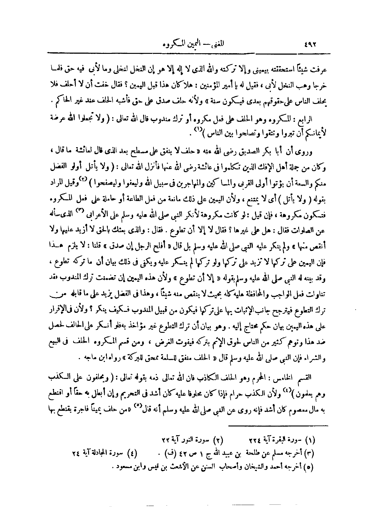 الرَّابِعُ، الْمَكْرُوهُ، وَهُوَ الْحَلِفُ عَلَى فِعْلِ مَكْرُوهٍ، أَوْ تَرْكِ مَنْدُوبٍ. قَالَ اللَّهُ تَعَالَى: {وَلا تَجْعَلُوا اللَّهَ عُرْضَةً لأَيْمَانِكُمْ أَنْ تَبَرُّوا وَتَتَّقُوا وَتُصْلِحُوا بَيْنَ النَّاسِ} [البقرة: ٢٢٤] . وَرُوِيَ أَنَّ أَبَا بَكْرٍ الصِّدِّيقَ - رَضِيَ اللَّهُ عَنْهُ - حَلَفَ لَا يُنْفِقُ عَلَى مِسْطَحٍ بَعْدَ الَّذِي قَالَ لِعَائِشَةَ مَا قَالَ، وَكَانَ مِنْ جُمْلَةِ أَهْلِ الْإِفْكِ الَّذِينَ تَكَلَّمُوا فِي عَائِشَةَ - رَضِيَ اللَّهُ عَنْهَا -، فَأَنْزَلَ اللَّهُ تَعَالَى: {وَلا يَأْتَلِ أُولُو الْفَضْلِ مِنْكُمْ وَالسَّعَةِ أَنْ يُؤْتُوا أُولِي الْقُرْبَى وَالْمَسَاكِينَ وَالْمُهَاجِرِينَ فِي سَبِيلِ اللَّهِ وَلْيَعْفُوا وَلْيَصْفَحُوا} [النور: ٢٢] وَقِيلَ: الْمُرَادُ بِقَوْلِهِ: {وَلا يَأْتَلِ} [النور: ٢٢] أَيْ لَا يَمْتَنِعْ. وَلِأَنَّ الْيَمِينَ عَلَى ذَلِكَ مَانِعَةٌ مِنْ فِعْلِ الطَّاعَةِ، أَوْ حَامِلَةٌ عَلَى فِعْلِ الْمَكْرُوهِ، فَتَكُونُ مَكْرُوهَةً.