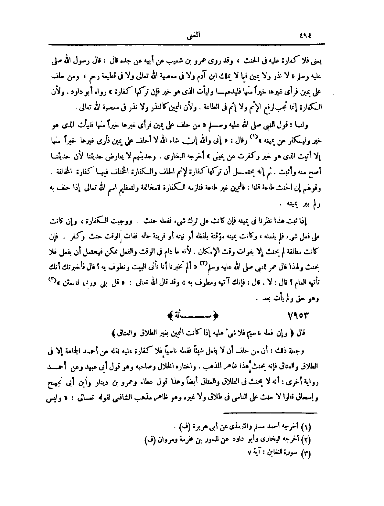 (٧٩٤٧) مَسْأَلَةٌ؛ قَالَ: (وَإِنْ فَعَلَهُ نَاسِيًا، فَلَا شَيْءَ عَلَيْهِ إذَا كَانَتْ الْيَمِينُ بِغَيْرِ الطَّلَاقِ وَالْعَتَاقِ) وَجُمْلَةُ ذَلِكَ أَنَّ مَنْ حَلَفَ أَنْ لَا يَفْعَلَ شَيْئًا، فَفَعَلَهُ نَاسِيًا. فَلَا كَفَّارَةَ عَلَيْهِ. نَقَلَهُ عَنْ أَحْمَدَ الْجَمَاعَةُ، إلَّا فِي الطَّلَاقِ وَالْعَتَاقِ، فَإِنَّهُ يَحْنَثُ. هَذَا ظَاهِرُ الْمَذْهَبِ. وَاخْتَارَهُ الْخَلَّالُ وَصَاحِبُهُ. وَهُوَ قَوْلُ أَبِي عُبَيْدٍ. وَعَنْ أَحْمَدَ، رِوَايَةٌ أُخْرَى، أَنَّهُ لَا يَحْنَثُ فِي الطَّلَاقِ وَالْعَتَاقِ أَيْضًا، وَهَذَا قَوْلُ عَطَاءٍ، وَعَمْرِو بْنِ دِينَارٍ، وَابْنِ أَبِي نَجِيحٍ، وَإِسْحَاقَ، قَالُوا: لَا حِنْثَ عَلَى النَّاسِي فِي طَلَاقٍ وَلَا غَيْرِهِ.