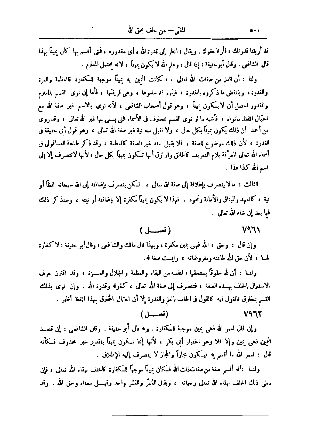 قَدْ أَرَيْتنَا قُدْرَتَك، فَأَرِنَا عَفْوَك. وَيُقَالُ: اُنْظُرْ إلَى قُدْرَةِ اللَّهِ. أَيْ مَقْدُورِهِ. فَمَتَى أَقْسَمَ بِهَذَا، كَانَ يَمِينًا. وَبِهَذَا قَالَ الشَّافِعِيُّ. وَقَالَ أَبُو حَنِيفَةَ، إذَا قَالَ: وَعِلْمِ اللَّهِ. لَا يَكُونُ يَمِينًا؛ لِأَنَّهُ يَحْتَمِلُ الْمَعْلُومَ. وَلَنَا، أَنَّ الْعِلْمَ مِنْ صِفَاتِ اللَّهِ - تَعَالَى، فَكَانَتْ الْيَمِينُ بِهِ يَمِينًا مُوجِبَةً لِلْكَفَّارَةِ، كَالْعَظَمَةِ، وَالْعِزَّةِ، وَالْقُدْرَةِ، وَيَنْتَقِضُ مَا ذَكَرُوهُ بِالْقُدْرَةِ، فَإِنَّهُمْ قَدْ سَلَّمُوهَا، وَهِيَ قَرِينَتُهَا.
