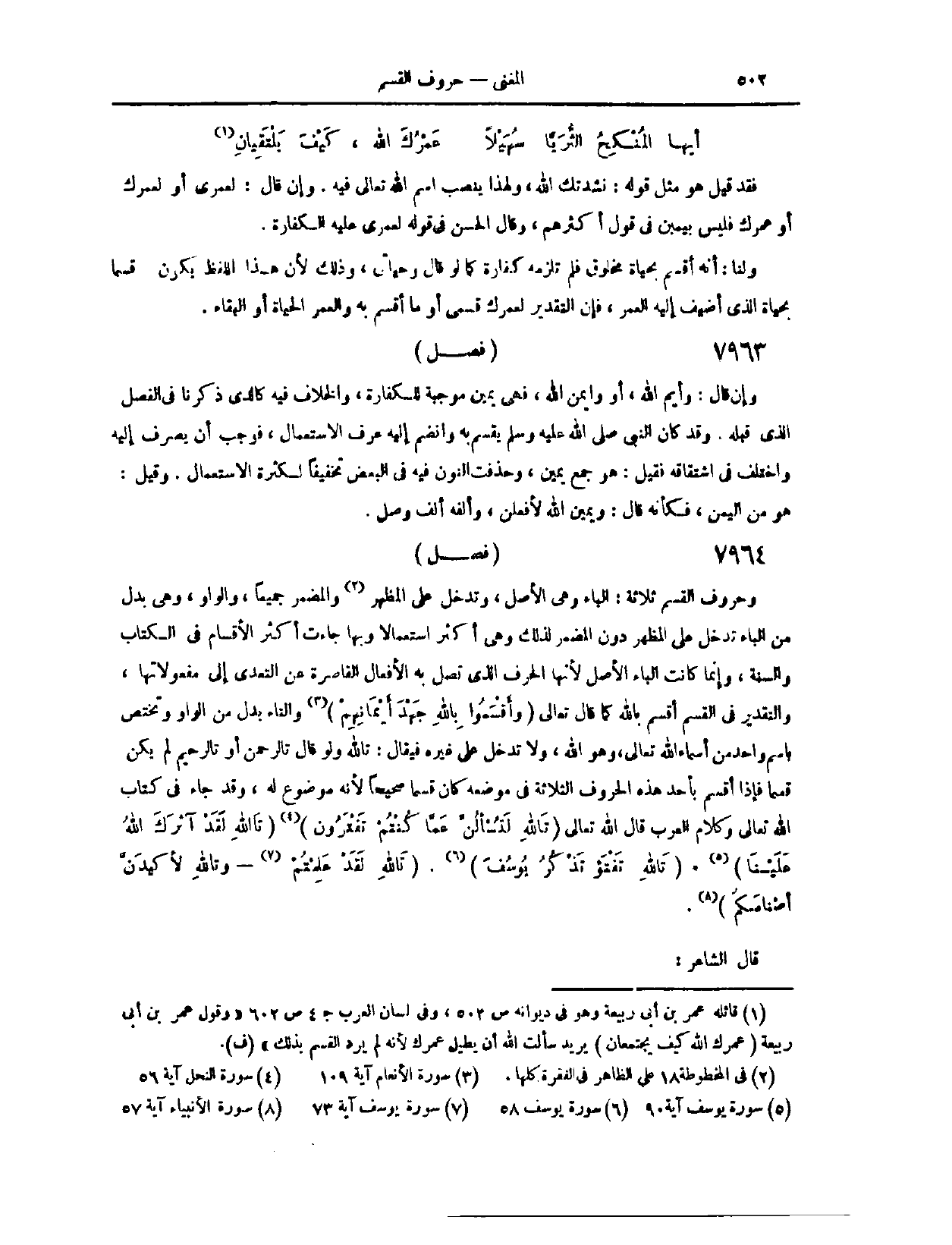 فَإِذَا أَقْسَمَ بِأَحَدِ هَذِهِ الْحُرُوفِ الثَّلَاثَةِ فِي مَوْضِعِهِ، كَانَ قَسَمًا صَحِيحًا؛ لِأَنَّهُ مَوْضُوعٌ لَهُ. وَقَدْ جَاءَ فِي كِتَابِ اللَّهِ - تَعَالَى، وَكَلَامِ الْعَرَبِ، قَالَ اللَّهِ تَعَالَى: {تَاللَّهِ لَتُسْأَلُنَّ عَمَّا كُنْتُمْ تَفْتَرُونَ} [النحل: ٥٦] . {تَاللَّهِ لَقَدْ آثَرَكَ اللَّهُ عَلَيْنَا} [يوسف: ٩١] . {تَاللَّهِ تَفْتَأُ تَذْكُرُ يُوسُفَ} [يوسف: ٨٥] . {تَاللَّهِ لَقَدْ عَلِمْتُمْ} [يوسف: ٧٣] . {وَتَاللَّهِ لأَكِيدَنَّ أَصْنَامَكُمْ} [الأنبياء: ٥٧] . وَقَالَ الشَّاعِرُ: