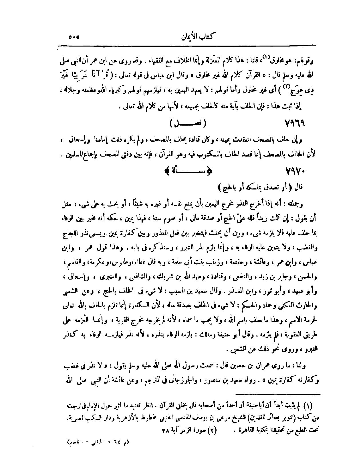 وَقَوْلُهُمْ: هُوَ مَخْلُوقٌ. قُلْنَا: هَذَا كَلَامُ الْمُعْتَزِلَةِ، وَإِنَّمَا الْخِلَافُ مَعَ الْفُقَهَاءِ، وَقَدْ رُوِيَ عَنْ ابْنِ عُمَرَ، أَنَّ النَّبِيَّ - صَلَّى اللَّهُ عَلَيْهِ وَسَلَّمَ - قَالَ: «الْقُرْآنُ كَلَامُ اللَّهِ غَيْرُ مَخْلُوقٍ» . وَقَالَ ابْنُ عَبَّاسٍ فِي قَوْله تَعَالَى: {قُرْآنًا عَرَبِيًّا غَيْرَ ذِي عِوَجٍ} [الزمر: ٢٨] . أَيْ: غَيْرَ مَخْلُوقٍ. وَأَمَّا قَوْلُهُمْ: لَا يُعْهَدُ الْيَمِينُ بِهِ. فَيَلْزَمُهُمْ قَوْلُهُمْ: وَكِبْرِيَاءِ اللَّهِ، وَعَظَمَتِهِ، وَجَلَالِهِ. إذَا ثَبَتَ هَذَا، فَإِنَّ الْحَلِفَ بِآيَةٍ مِنْهُ كَالْحَلِفِ بِجَمِيعِهِ؛ لِأَنَّهَا مِنْ كَلَامِ اللَّهِ تَعَالَى.
