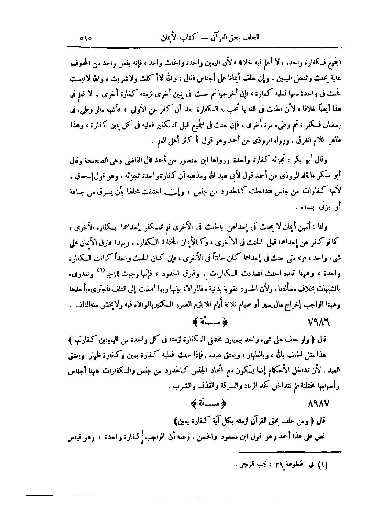 (٧٩٨١) مَسْأَلَةٌ؛ قَالَ: (وَمَنْ حَلَفَ بِحَقِّ الْقُرْآنِ، لَزِمَتْهُ بِكُلِّ آيَةٍ كَفَّارَةُ يَمِينٍ) نَصَّ عَلَى هَذَا أَحْمَدُ. وَهُوَ قَوْلُ ابْنِ مَسْعُودٍ، وَالْحَسَنِ. وَعَنْهُ، أَنَّ الْوَاجِبَ كَفَّارَةٌ وَاحِدَةٌ. وَهُوَ قِيَاسُ