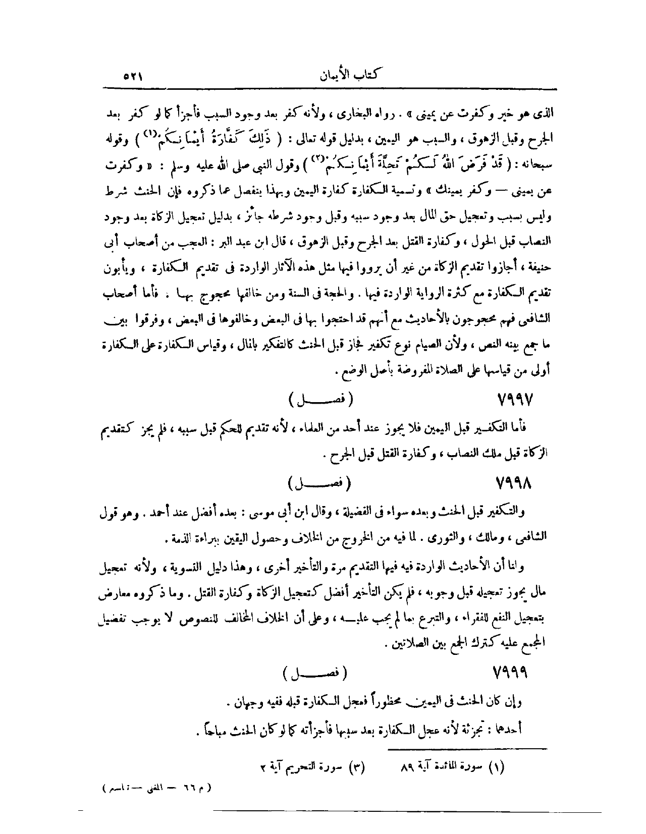 (٧٩٩٢) فَصْلٌ وَالتَّكْفِيرُ قَبْلَ الْحِنْثِ وَبَعْدَهُ سَوَاءٌ فِي الْفَضِيلَةِ. وَقَالَ ابْنُ أَبِي مُوسَى: بَعْدَهُ أَفْضَلُ عِنْدَ أَحْمَدَ. وَهُوَ قَوْلُ الشَّافِعِيِّ، وَمَالِكٍ، وَالثَّوْرِيِّ؛ لِمَا فِيهِ مِنْ الْخُرُوجِ مِنْ الْخِلَافِ وَحُصُولِ الْيَقِينِ بِبَرَاءَةِ الذِّمَّةِ. وَلَنَا، أَنَّ الْأَحَادِيثَ الْوَارِدَةَ فِيهِ، فِيهَا التَّقْدِيمُ مَرَّةً وَالتَّأْخِيرُ أُخْرَى، وَهَذَا دَلِيلُ التَّسْوِيَةِ، وَلِأَنَّهُ تَعْجِيلُ مَالٍ يَجُوزُ تَعْجِيلُهُ قَبْلَ وُجُوبِهِ، فَلَمْ يَكُنْ التَّأْخِيرُ أَفْضَلَ، كَتَعْجِيلِ الزَّكَاةِ وَكَفَّارَةِ الْقَتْلِ، وَمَا ذَكَرُوهُ مُعَارَضٌ بِتَعْجِيلِ النَّفْعِ لِلْفُقَرَاءِ، وَالتَّبَرُّعِ بِمَا لَمْ يَجِبْ عَلَيْهِ، وَعَلَى أَنَّ الْخِلَافَ الْمُخَالِفَ لِلنُّصُوصِ لَا يُوجِبُ تَفْضِيلَ الْمُجْمَعِ عَلَيْهِ، كَتَرْكِ الْجَمْعِ بَيْنَ الصَّلَاتَيْنِ.