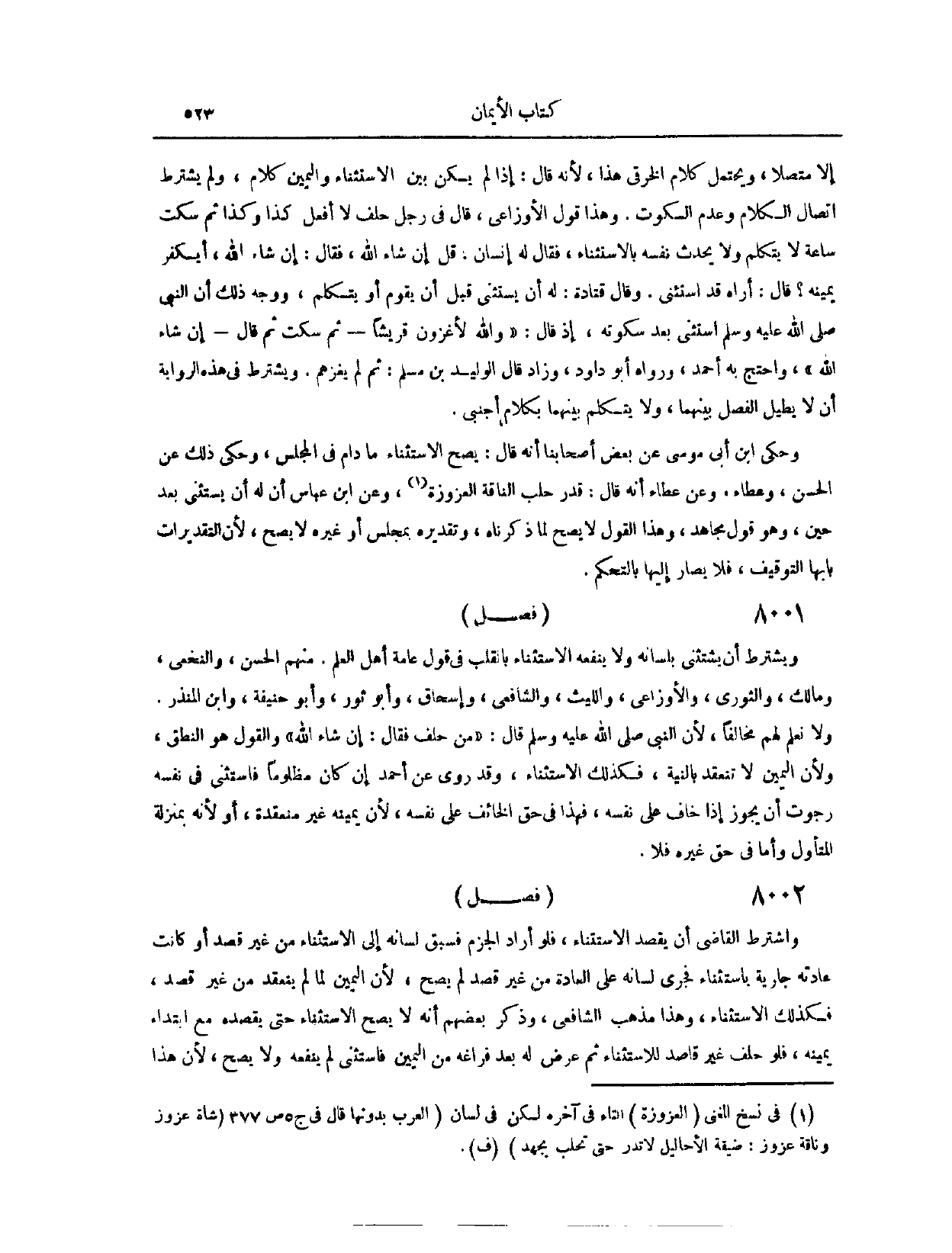 فَهَذَا فِي حَقِّ الْخَائِفِ عَلَى نَفْسِهِ؛ لِأَنَّ يَمِينَهُ غَيْرُ مُنْعَقِدَةٍ أَوْ لِأَنَّهُ بِمَنْزِلَةِ الْمُتَأَوِّلِ، وَأَمَّا فِي حَقِّ غَيْرِهِ فَلَا. (٧٩٩٦) فَصْلٌ: وَاشْتَرَطَ الْقَاضِي أَنْ يَقْصِدَ الِاسْتِثْنَاءَ، فَلَوْ أَرَادَ الْجَزْمَ، فَسَبَقَ لِسَانُهُ إلَى الِاسْتِثْنَاءِ مِنْ غَيْرِ قَصْدٍ، أَوْ كَانَتْ عَادَتُهُ جَارِيَةً بِالِاسْتِثْنَاءِ، فَجَرَى لِسَانُهُ عَلَى الْعَادَةِ مِنْ غَيْرِ قَصْدٍ، لَمْ يَصِحَّ؛ لِأَنَّ الْيَمِينَ لَمَّا لَمْ يَنْعَقِدْ مِنْ غَيْرِ قَصْدٍ، فَكَذَلِكَ الِاسْتِثْنَاءُ.