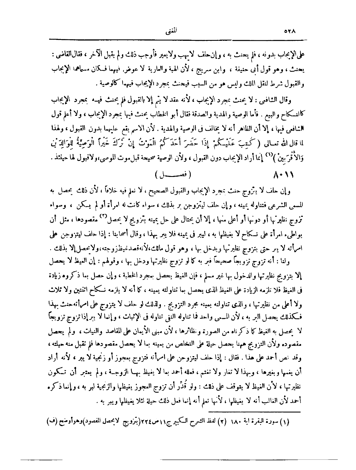 (٨٠٠٦) فَصْلٌ: وَإِنْ حَلَفَ لَا يَتَزَوَّجُ، حَنِثَ بِمُجَرَّدِ الْإِيجَابِ، وَالْقَبُولُ الصَّحِيحُ. لَا نَعْلَمُ فِيهِ خِلَافًا؛ لِأَنَّ ذَلِكَ يَحْصُلُ بِهِ الْمُسَمَّى الشَّرْعِيُّ، فَتَنَاوَلَهُ يَمِينُهُ. وَإِنْ حَلَفَ لَيَتَزَوَّجَنَّ، بَرَّ بِذَلِكَ، سَوَاءٌ كَانَتْ لَهُ امْرَأَةٌ أَوْ لَمْ يَكُنْ، وَسَوَاءٌ تَزَوَّجَ نَظِيرَتَهَا أَوْ دُونَهَا أَوْ أَعْلَى مِنْهَا، إلَّا أَنْ يَحْتَالَ عَلَى حَلِّ يَمِينِهِ بِتَزْوِيجٍ لَا يُحَصِّلُ مَقْصُودَهَا، مِثْلَ أَنْ يُوَاطِئَ امْرَأَتَهُ عَلَى نِكَاحٍ لَا يَغِيظُهَا بِهِ، لِيَبَرَّ فِي يَمِينِهِ، فَلَا يَبَرُّ بِهَذَا. وَقَالَ أَصْحَابُنَا: إذَا حَلَفَ لَيَتَزَوَّجَنَّ عَلَى امْرَأَتِهِ، لَا يَبَرُّ حَتَّى يَتَزَوَّجَ نَظِيرَتَهَا، وَيَدْخُلَ بِهَا. وَهُوَ قَوْلُ مَالِكٍ؛ لِأَنَّهُ قَصَدَ غَيْظَ زَوْجَتِهِ، وَلَا يَحْصُلُ إلَّا بِذَلِكَ.