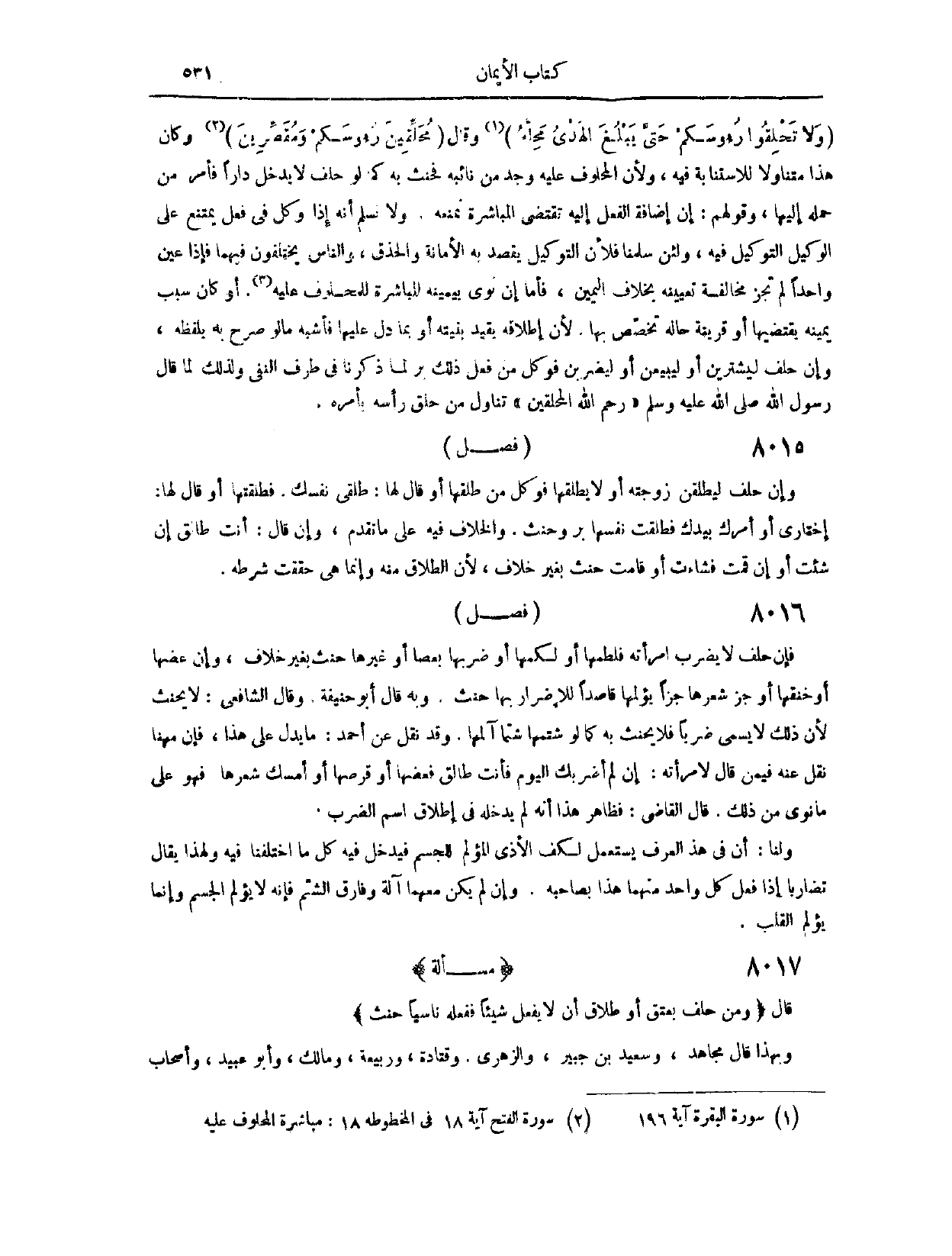 {وَلا تَحْلِقُوا رُءُوسَكُمْ حَتَّى يَبْلُغَ الْهَدْيُ مَحِلَّهُ} [البقرة: ١٩٦] وَقَالَ: {مُحَلِّقِينَ رُءُوسَكُمْ وَمُقَصِّرِينَ} [الفتح: ٢٧] . وَكَانَ هَذَا مُتَنَاوِلًا لِلِاسْتِنَابَةِ فِيهِ. وَلِأَنَّ الْمَحْلُوفَ عَلَيْهِ وُجِدَ مِنْ نَائِبِهِ، فَحَنِثَ بِهِ، كَمَا لَوْ حَلَفَ لَا يَدْخُلُ دَارًا، فَأَمَرَ مَنْ حَمَلَهُ إلَيْهَا.