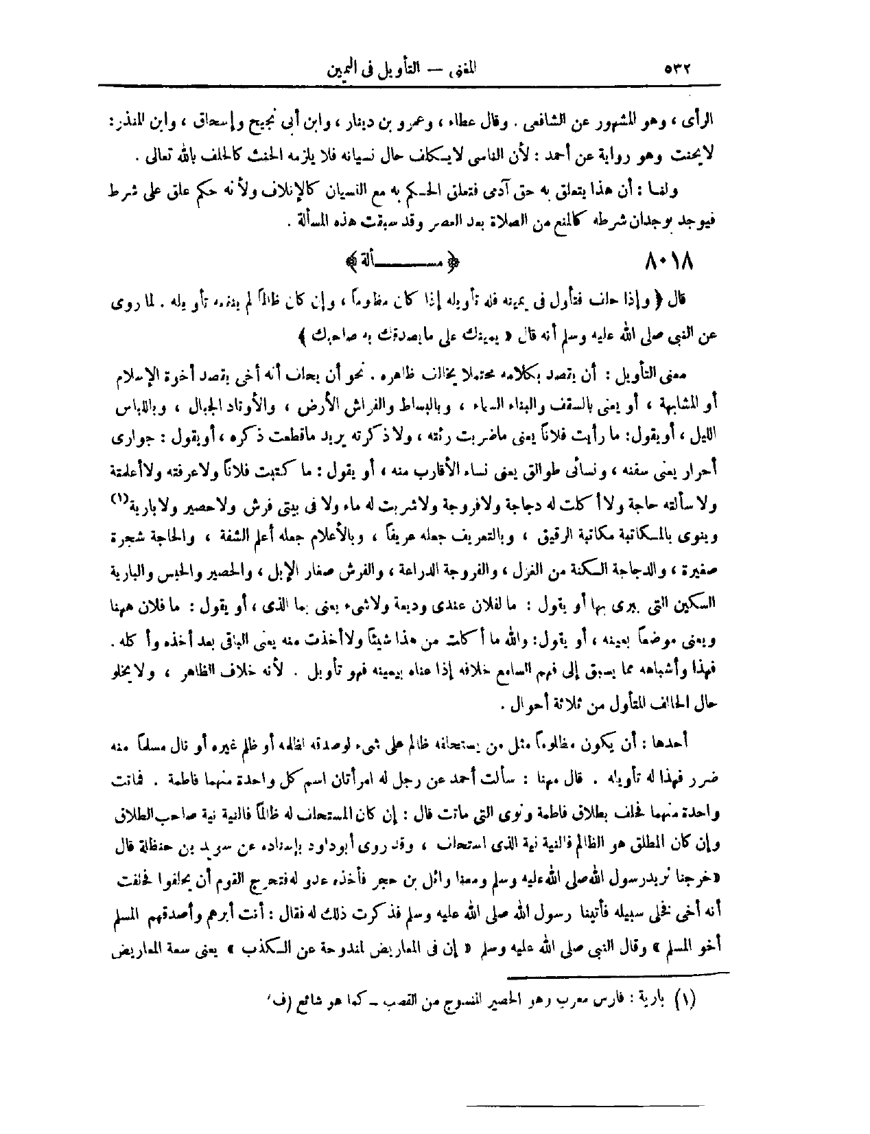 (٨٠١٣) مَسْأَلَةٌ؛ قَالَ: وَإِذَا حَلَفَ، فَتَأَوَّلَ فِي يَمِينِهِ، فَلَهُ تَأْوِيلُهُ إذَا كَانَ مَظْلُومًا، وَإِنْ كَانَ ظَالِمًا، لَمْ يَنْفَعْهُ تَأْوِيلُهُ، لِمَا رُوِيَ عَنْ النَّبِيِّ - صَلَّى اللَّهُ عَلَيْهِ وَسَلَّمَ - أَنَّهُ قَالَ «يَمِينُك عَلَى مَا يُصَدِّقُكَ بِهِ صَاحِبُك» مَعْنَى التَّأْوِيلِ، أَنْ يَقْصِدَ بِكَلَامِهِ مُحْتَمَلًا يُخَالِفُ ظَاهِرَهُ، نَحْوَ أَنْ يَحْلِفَ إنَّهُ أَخِي، يَقْصِدُ أُخُوَّةَ الْإِسْلَامِ، أَوْ الْمُشَابَهَةَ، أَوْ يَعْنِي بِالسَّقْفِ وَالْبِنَاءِ السَّمَاءَ، وَبِالْبِسَاطِ وَالْفِرَاشِ الْأَرْضَ، وَبِالْأَوْتَادِ الْجِبَالَ، وَبِاللِّبَاسِ اللَّيْلَ، أَوْ يَقُولَ: مَا رَأَيْت فُلَانًا. يَعْنِي مَا ضَرَبْت رِئَتَهُ. وَلَا ذَكَرْتُهُ. يُرِيدُ مَا قَطَعْت ذَكَرَهُ. أَوْ يَقُولَ: جَوَارِيَّ أَحْرَارٌ. يَعْنِي سُفُنَهُ. وَنِسَائِي طَوَالِقُ. يَعْنِي نِسَاءَ الْأَقَارِبِ مِنْهُ.