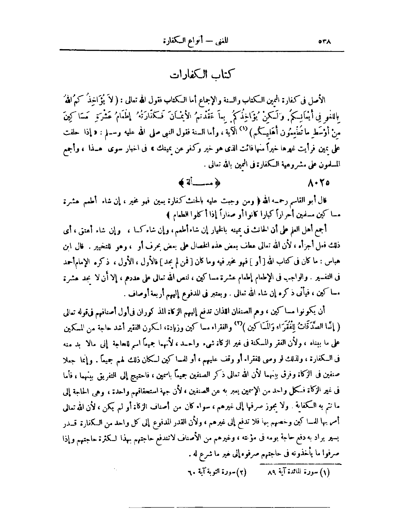 (٨٠٢٠) مَسْأَلَةٌ؛ قَالَ أَبُو الْقَاسِمِ - رَحِمَهُ اللَّهُ -: (وَمَنْ وَجَبَتْ عَلَيْهِ بِالْحِنْثِ كَفَّارَةُ يَمِينٍ، فَهُوَ مُخَيَّرٌ إنْ شَاءَ أَطْعَمَ عَشَرَةَ مَسَاكِينَ مُسْلِمِينَ أَحْرَارًا، كِبَارًا كَانُوا أَوْ صِغَارًا، إذَا أَكَلُوا الطَّعَامَ) أَجْمَعَ أَهْلُ الْعِلْمِ، عَلَى أَنَّ الْحَانِثَ فِي يَمِينِهِ بِالْخِيَارِ؛ إنْ شَاءَ أَطْعَمَ، وَإِنْ شَاءَ كَسَا، وَإِنْ شَاءَ أَعْتَقَ، أَيَّ ذَلِكَ فَعَلَ أَجْزَأَهُ؛ لِأَنَّ اللَّهَ - تَعَالَى - عَطَفَ بَعْضَ هَذِهِ الْخِصَالِ عَلَى بَعْضٍ بِحَرْفِ " أَوْ "، وَهُوَ لِلتَّخْيِيرِ.