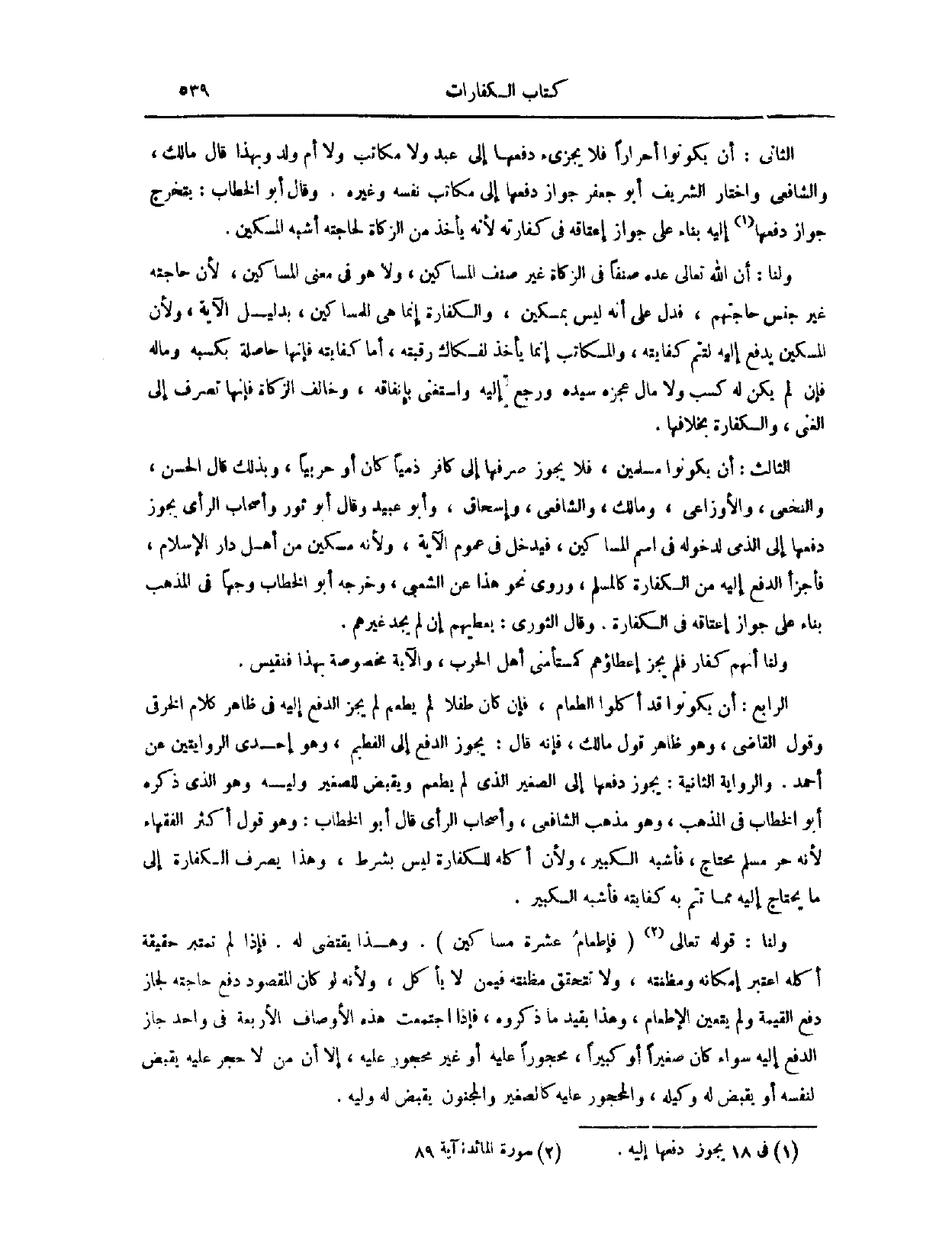 وَلَنَا، أَنَّ اللَّهَ - تَعَالَى - عَدَّهُ صِنْفًا فِي الزَّكَاةِ غَيْرَ صِنْفِ الْمَسَاكِينِ، وَلَا هُوَ فِي مَعْنَى الْمَسَاكِينِ؛ لِأَنَّ حَاجَتَهُ مِنْ غَيْرِ جِنْسِ حَاجَتِهِمْ، فَدَلَّ عَلَى أَنَّهُ لَيْسَ بِمِسْكِينٍ، وَالْكَفَّارَةُ إنَّمَا هِيَ لِلْمَسَاكِينِ؛ بِدَلِيلِ الْآيَةِ، وَلِأَنَّ الْمِسْكِينَ يُدْفَعُ إلَيْهِ لِتَتِمَّ كِفَايَتُهُ، وَالْمُكَاتَبُ إنَّمَا يَأْخُذُ لِفِكَاكِ رَقَبَتِهِ، أَمَّا كِفَايَتُهُ فَإِنَّهَا حَاصِلَةٌ بِكَسْبِهِ وَمَالِهِ، فَإِنْ لَمْ يَكُنْ لَهُ كَسْبٌ وَلَا مَالٌ، عَجَّزَهُ سَيِّدُهُ، وَرَجَعَ إلَيْهِ، وَاسْتَغْنَى بِإِنْفَاقِهِ، وَخَالَفَ الزَّكَاةَ؛ فَإِنَّهَا تُصْرَفُ إلَى الْغَنِيِّ، وَالْكَفَّارَةُ بِخِلَافِهَا. الثَّالِثُ، أَنْ يَكُونُوا مُسْلِمِينَ، وَلَا يَجُوزُ صَرْفُهَا إلَى كَافِرٍ، ذِمِّيًّا كَانَ أَوْ حَرْبِيًّا.