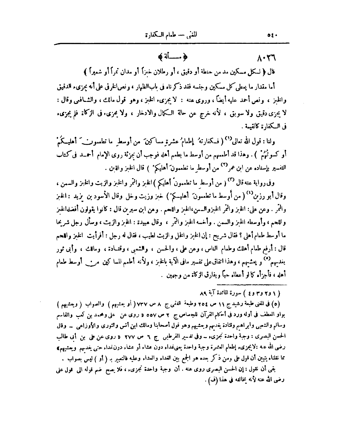 وَسَأَلَ رَجُلٌ شُرَيْحًا مَا أَوْسَطُ طَعَامِ أَهْلِي؟ فَقَالَ شُرَيْحٌ إنَّ الْخُبْزَ وَالْخَلَّ وَالزَّيْتَ لَطَيِّبٌ. فَقَالَ لَهُ رَجُلٌ: أَفَرَأَيْت الْخُبْزَ وَاللَّحْمَ؟ قَالَ: أَرْفَعُ طَعَامِ أَهِلَك، وَطَعَامِ النَّاسِ؟ وَعَنْ عَلِيٍّ وَالْحَسَنِ، وَالشَّعْبِيِّ، وَقَتَادَةَ، وَمَالِكٍ، وَأَبِي ثَوْرٍ يُغَدِّيهِمْ أَوْ يُعَشِّيهِمْ. وَهَذَا اتِّفَاقٌ عَلَى تَفْسِيرِ مَا فِي الْآيَةِ بِالْخُبْزِ، وَلِأَنَّهُ أَطْعَمَ الْمَسَاكِينَ مِنْ أَوْسَطِ طَعَامِ أَهْلِهِ، فَأَجْزَأَهُ، كَمَا لَوْ أَعْطَاهُ حَبًّا، وَيُفَارِقُ الزَّكَاةَ مِنْ وَجْهَيْنِ؛