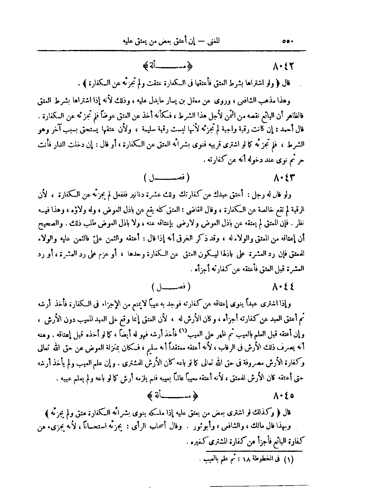 (٨٠٣٩) فَصْلٌ: وَإِذَا اشْتَرَى عَبْدًا يَنْوِي إعْتَاقَهُ عَنْ كَفَّارَتِهِ، فَوَجَدَ بِهِ عَيْبًا لَا يَمْنَعُ مِنْ الْإِجْزَاءِ فِي الْكَفَّارَةِ، فَأَخَذَ أَرْشَهُ ثُمَّ أَعْتَقَ الْعَبْدَ عَنْ كَفَّارَتِهِ، أَجْزَأَهُ، وَكَانَ الْأَرْشُ لَهُ؛ لِأَنَّ الْعِتْقَ إنَّمَا وَقَعَ عَلَى الْعَبْدِ الْمَعِيبِ دُونَ الْأَرْشِ. وَإِنْ أَعْتَقَهُ قَبْلَ الْعِلْمِ بِالْعَيْبِ، ثُمَّ ظَهَرَ عَلَى الْعَيْبِ، فَأَخَذَ أَرْشَهُ، فَهُوَ لَهُ أَيْضًا، كَمَا لَوْ أَخَذَهُ قَبْلَ إعْتَاقِهِ. وَعَنْهُ، أَنَّهُ يَصْرِفُ ذَلِكَ الْأَرْشَ فِي الرِّقَابِ؛ لِأَنَّهُ أَعْتَقَهُ مُعْتَقِدًا أَنَّهُ سَلِيمٌ، فَكَانَ بِمَنْزِلَةِ الْعِوَضِ عَنْ حَقِّ اللَّهِ - تَعَالَى -، وَكَفَّارَةُ الْأَرْشِ مَصْرُوفَةٌ فِي حَقِّ اللَّهِ - تَعَالَى، كَمَا لَوْ بَاعَهُ كَانَ الْأَرْشُ لِلْمُشْتَرِي. وَإِنْ عَلِمَ الْعَيْبَ، وَلَمْ يَأْخُذْ أَرْشَهُ حَتَّى أَعْتَقَهُ، كَانَ الْأَرْشُ لِلْمُعْتِقِ؛ لِأَنَّهُ أَعْتَقَهُ مَعِيبًا عَالِمًا بِعَيْبِهِ، فَلَمْ يَلْزَمْهُ أَرْشٌ، كَمَا لَوْ بَاعَهُ وَلَمْ يَعْلَمْ عَيْبَهُ.