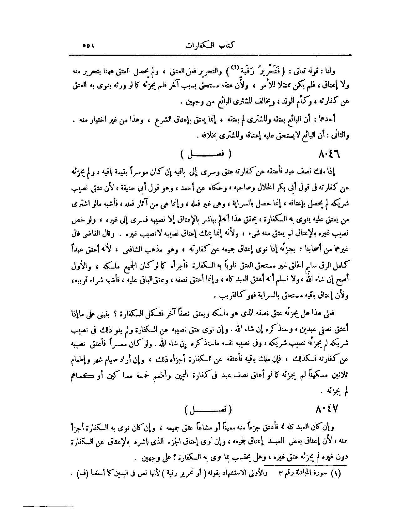 (٨٠٤١) فَصْلٌ: إذَا مَلَكَ نِصْفَ عَبْدٍ، فَأَعْتَقَهُ عَنْ كَفَّارَتِهِ، عَتَقَ، وَسَرَى إلَى بَاقِيهِ إنْ كَانَ مُوسِرًا بِقِيمَةِ بَاقِيهِ، وَلَمْ يُجْزِئْهُ عَنْ كَفَّارَتِهِ، فِي قَوْلِ أَبِي بَكْرٍ الْخَلَّالِ، وَصَاحِبِهِ، وَحَكَاهُ عَنْ أَحْمَدَ. وَهُوَ قَوْلُ أَبِي حَنِيفَةَ؛ لِأَنَّ عِتْقَ نَصِيبِ شَرِيكِهِ لَمْ يَحْصُلْ بِإِعْتَاقِهِ، إنَّمَا حَصَلَ بِالسِّرَايَةِ، وَهِيَ غَيْرُ فِعْلِهِ، وَإِنَّمَا هِيَ مِنْ آثَارِ فِعْلِهِ فَأَشْبَهَ مَا لَوْ اشْتَرَى مَنْ يَعْتِقُ عَلَيْهِ يَنْوِي بِهِ الْكَفَّارَةَ، يُحَقِّقُ هَذَا، أَنَّهُ لَمْ يُبَاشِرْ بِالْإِعْتَاقِ إلَّا نَصِيبَهُ، فَسَرَى إلَى غَيْرِهِ، وَلَوْ خَصَّ نَصِيبَ غَيْرِهِ بِالْإِعْتَاقِ، لَمْ يُعْتَقْ مِنْهُ شَيْءٌ، وَلِأَنَّهُ إنَّمَا يَمْلِكُ إعْتَاقَ نَصِيبِهِ، لَا نَصِيبِ غَيْرِهِ. وَقَالَ الْقَاضِي: قَالَ غَيْرُهُمَا مِنْ أَصْحَابِنَا: يُجْزِئُهُ إذَا نَوَى إعْتَاقَ جَمِيعِهِ عَنْ كَفَّارَتِهِ.