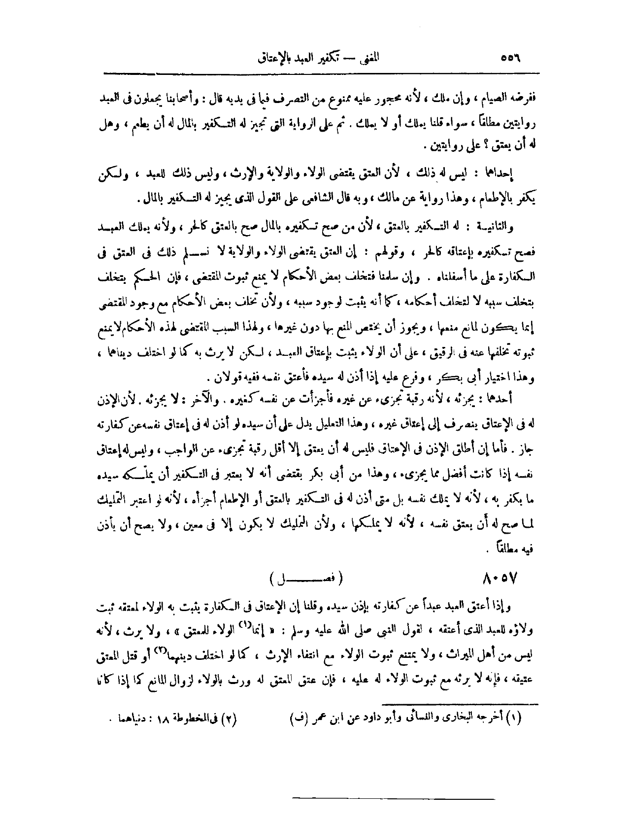 وَالثَّانِيَةُ لَهُ التَّكْفِيرُ بِالْعِتْقِ؛ لِأَنَّ مَنْ صَحَّ تَكْفِيرُهُ بِالْمَالِ، صَحَّ بِالْعِتْقِ، كَالْحُرِّ، وَلِأَنَّهُ يَمْلِكُ الْعَبْدَ، فَصَحَّ تَكْفِيرُهُ بِإِعْتَاقِهِ، كَالْحُرِّ. وَقَوْلُهُمْ: إنَّ الْعِتْقَ يَقْتَضِي الْوَلَاءَ وَالْوِلَايَةَ. لَا نُسَلِّمُ ذَلِكَ فِي الْعِتْقِ فِي الْكَفَّارَةِ، عَلَى مَا أَسْلَفْنَاهُ، وَإِنْ سَلَّمْنَا، فَتَخَلُّفُ بَعْضِ الْأَحْكَامِ لَا يَمْنَعُ ثُبُوتَ الْمُقْتَضِي، فَإِنَّ الْحُكْمَ يَتَخَلَّفُ لِتَخَلُّفِ سَبَبِهِ لَا لِتَخَلُّفِ أَحْكَامِهِ، كَمَا أَنَّهُ يَثْبُتُ لِوُجُودِ سَبَبِهِ، وَلِأَنَّ تَخَلُّفَ بَعْضِ الْأَحْكَامِ مَعَ وُجُودِ الْمُقْتَضِي، إنَّمَا يَكُونُ لِمَانِعٍ مَنَعَهَا، وَيَجُوزُ أَنْ يَخْتَصَّ الْمَنْعُ بِهَا دُونَ غَيْرِهَا. وَلِهَذَا السَّبَبِ الْمُقْتَضِي لِهَذِهِ الْأَحْكَامِ لَا يَمْنَعُ ثُبُوتُهُ تَخَلُّفَهَا عَنْهُ فِي الرَّقِيقِ، عَلَى أَنَّ الْوَلَاءَ يَثْبُتُ بِإِعْتَاقِ الْعَبْدِ، لَكِنْ لَا يَرِثُ بِهِ، كَمَا لَوْ اخْتَلَفَ دِينَاهُمَا. وَهَذَا اخْتِيَارُ أَبِي بَكْرٍ، وَفَرَّعَ عَلَيْهِ إذَا أَذِنَ لَهُ سَيِّدُهُ فَأَعْتَقَ نَفْسَهُ، فَفِيهِ قَوْلَانِ.
