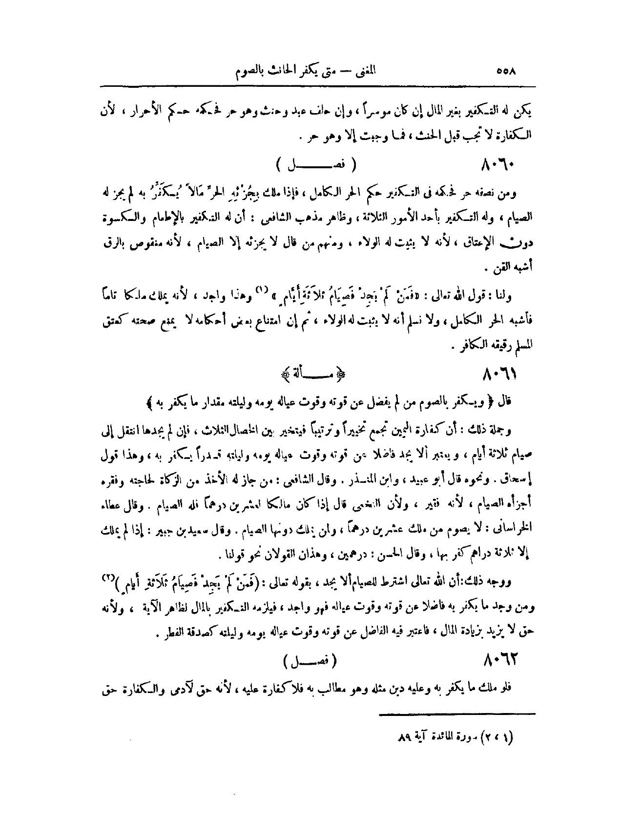 (٨٠٥٥) فَصْلٌ: مَنْ نِصْفُهُ حُرٌّ، حُكْمُهُ فِي التَّكْفِيرِ حُكْمُ الْحُرِّ الْكَامِلِ، فَإِذَا مَلَكَ بِجُزْئِهِ الْحُرِّ مَا لَا يُكَفِّرُ بِهِ، لَمْ يَجُزْ لَهُ الصِّيَامُ، وَلَهُ التَّكْفِيرُ بِأَحَدِ الْأُمُورِ الثَّلَاثَةِ. وَظَاهِرُ مَذْهَبِ الشَّافِعِيِّ، أَنَّ لَهُ التَّكْفِيرَ بِالْإِطْعَامِ وَالْكِسْوَةِ دُونَ الْإِعْتَاقِ؛ لِأَنَّهُ لَا يَثْبُتُ لَهُ الْوَلَاءُ. وَمِنْهُمْ مَنْ قَالَ: لَا يُجْزِئُهُ إلَّا الصِّيَامُ؛ لِأَنَّهُ مَنْقُوصٌ بِالرِّقِّ، أَشْبَهَ الْقِنَّ.