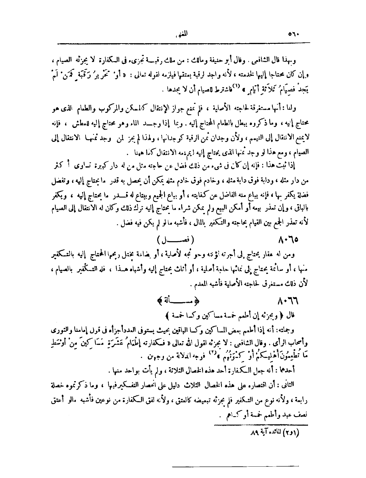 فَصْلٌ: وَمَنْ لَهُ عَقَارٌ يَحْتَاجُ إلَى أُجْرَتِهِ لِمُؤْنَتِهِ أَوْ حَوَائِجِهِ الْأَصْلِيَّةِ، أَوْ بِضَاعَةٌ يَخْتَلُّ رِبْحُهَا الْمُحْتَاجُ إلَيْهِ بِالتَّكْفِيرِ مِنْهَا، أَوْ سَائِمَةٌ يَحْتَاجُ إلَى نَمَائِهَا حَاجَةً أَصْلِيَّةً، أَوْ أَثَاثٌ يَحْتَاجُ إلَيْهِ، وَأَشْبَاهُ هَذَا، فَلَهُ التَّكْفِيرُ بِالصِّيَامِ؛ لِأَنَّ ذَلِكَ مُسْتَغْرِقٌ لِحَاجَتِهِ الْأَصْلِيَّةِ، فَأَشْبَهَ الْمُعْدِمَ.