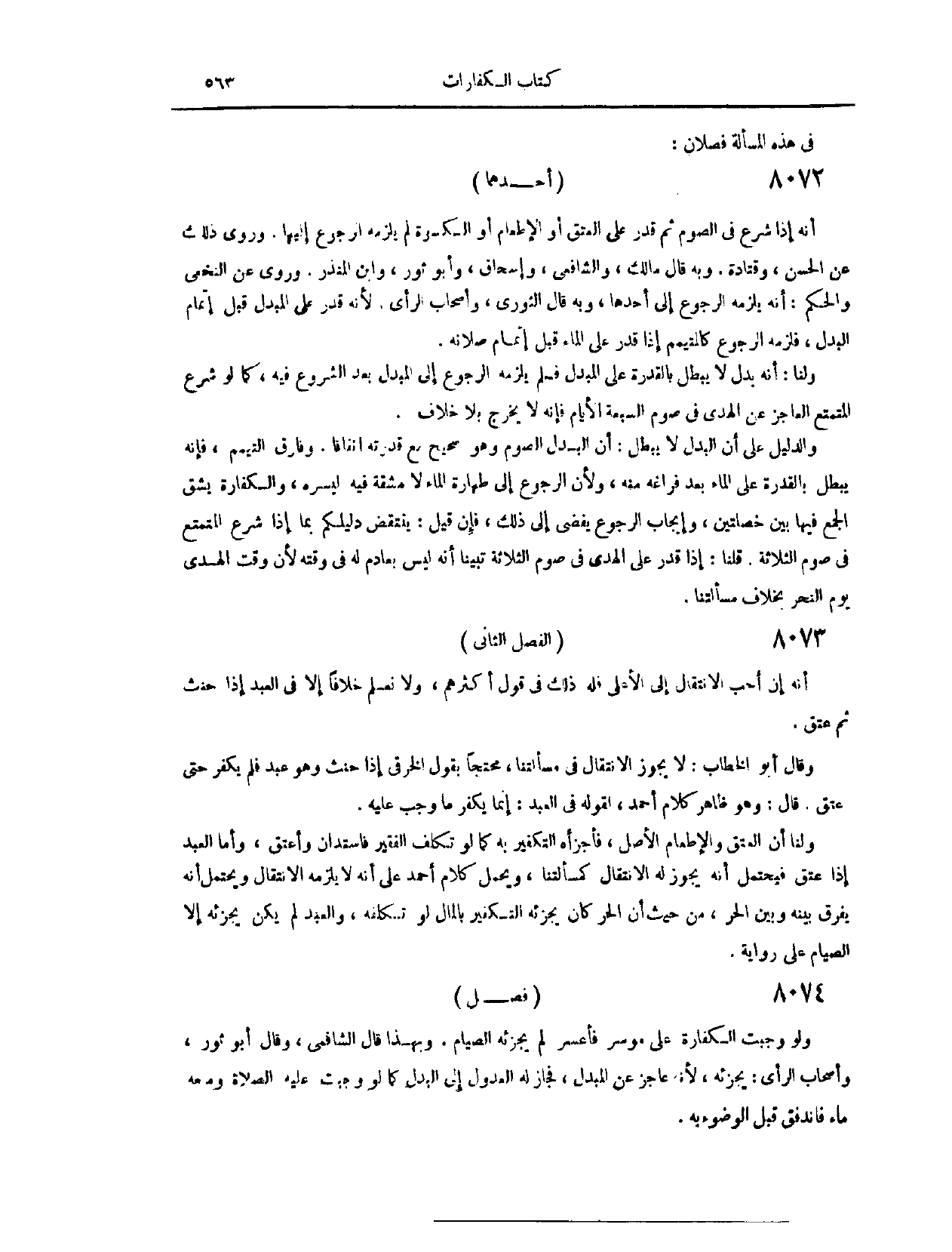 (٨٠٦٧) مَسْأَلَةٌ فِي هَذِهِ الْمَسْأَلَةِ فَصْلَانِ: الْفَصْلُ الْأَوَّلُ: أَنَّهُ إذَا شَرَعَ فِي الصَّوْمِ، ثُمَّ قَدَرَ عَلَى الْعِتْقِ أَوْ الْإِطْعَامِ أَوْ الْكِسْوَةِ، لَمْ يَلْزَمْهُ الرُّجُوعُ إلَيْهَا. رُوِيَ ذَلِكَ عَنْ الْحَسَنِ، وَقَتَادَةَ. وَبِهِ قَالَ مَالِكٌ، وَالشَّافِعِيُّ، وَإِسْحَاقُ، وَأَبُو ثَوْرٍ وَابْنُ الْمُنْذِرِ. وَرُوِيَ عَنْ النَّخَعِيِّ، وَالْحَكَمِ، أَنَّهُ يَلْزَمُهُ الرُّجُوعُ، إلَى أَحَدِهَا.