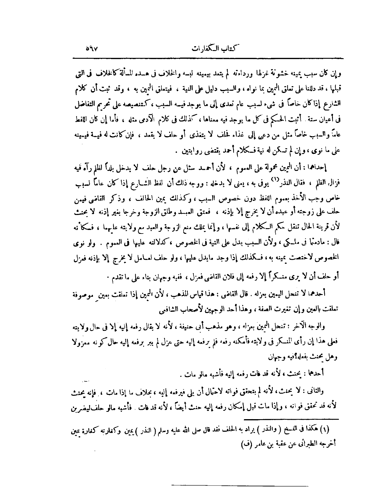وَوَجْهُ ذَلِكَ أَنَّ لَفْظَ الشَّارِعِ إذَا كَانَ عَامًّا، لِسَبَبٍ خَاصٍّ، وَجَبَ الْأَخْذُ بِعُمُومِ اللَّفْظِ دُونَ خُصُوصِ السَّبَبِ، كَذَلِكَ يَمِينُ الْحَالِفِ. وَذَكَرَ الْقَاضِي فِيمَنْ حَلَفَ عَلَى زَوْجَتِهِ أَوْ عَبْدِهِ أَنْ لَا يَخْرُجَ إلَّا بِإِذْنِهِ، فَعَتَقَ الْعَبْدُ، وَطَلَّقَ الزَّوْجَةَ، وَخَرَجَا بِغَيْرِ إذْنِهِ، لَا يَحْنَثُ؛ لِأَنَّ قَرِينَةَ الْحَالِ تَنْقُلُ حُكْمَ الْكَلَامِ إلَى نَفْسِهَا، وَإِنَّمَا يَمْلِكُ مَنْعَ الزَّوْجَةِ وَالْعَبْدِ مَعَ وِلَايَتِهِ عَلَيْهِمَا، فَكَأَنَّهُ قَالَ: مَا دُمْتُمَا فِي مِلْكِي. وَلِأَنَّ السَّبَبَ يَدُلُّ عَلَى النِّيَّةِ فِي الْخُصُوصِ، كَدَلَالَتِهِ عَلَيْهَا فِي الْعُمُومِ وَلَوْ نَوَى الْخُصُوصَ لَاخْتَصَّتْ يَمِينُهُ بِهِ، فَكَذَلِكَ إذَا وَجَدَ مَا يَدُلُّ عَلَيْهَا.
