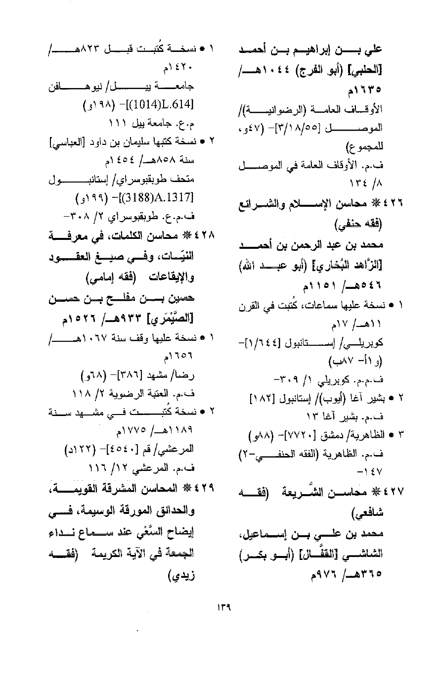 (1) ورد عنوان هذه النسخة في الفهرس: المحيط، ومؤلفها محمد بن عبد العزيز بن عمر. وأوضح المفهرس أنّ محتويات هذه النسخة مماثلة لمحتويات المحيط البرهاني الذي أشار إليه وإلى اسم واضعه. ولذلك أوردناها ضمن نسخه بسبب هذا التماثل كما جاء في الفهرس.