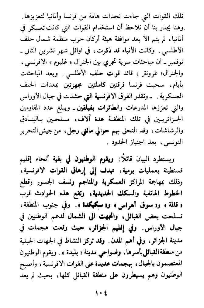 تلك القوات التي جاءت نجدات هامة من فرنسا وألمانيا لتعزيزها. وهنا يجدر بنا أن نلاحظ أن استخدام القوات التي كانت تعسكر في ألمانيا، لم يتم الا بعد موافقة هيئة أركان حرب منظمة شمال حلف الأطلسي. وكانت الأنباء قد ذكرت، في أوائل شهر تشرين الثاني - نوفمبر - أن مباحثات سرية تجري بين الجنرال (غليوم) الافرنسي، والجنرال (غرونتر) قائد قوات حلف الأطلسي. وبعد المباحثات بأيام، سحبت فرنسا فرقتين كاملتين مجهزتين بمعدات الحلف العسكرية. - وتقدر الفرق الافرنسية التي حشدت في جبال الأوراس والتي تعززها المدرعات والطائرات بفيلقين - ويبلغ عدد المقاومين الجزائريين في تلك المنطقة عدة آلاف، مسلحين بالبنادق والرشاشات، وقد التحق بهم حوالي مائتي رجل، من جيش التحرير التونسي، بعد اجتياز الحدود.