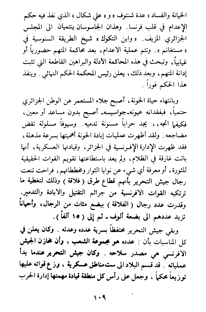 الخيانة والفساد (عدة شنتوف) و (علي شكال) الذي نفذ فيه حكم الإعدام في قلب فرنسا. وهذان الجاسوسان ينتميان الى المجلس الجزائري المزيف. (وابن التكوك) شيخ الطريقة السنوسية في (مستغانم). وتتم عملية الاعدام، بعد محاكمة المتهم حضوريا أو غيابيا، وتبحث في هذه المحاكمة الأدلة والبراهين القاطعة التي تثبت إدانة المتهم، وبعد ذلك، يعلن رئيس المحكمة الحكم النهائي. وينفذ هذا الحكم فورا.