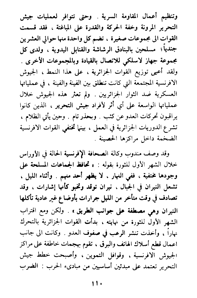 وتنظيم أعمال المقاومة السرية. وحتى تتوافر لعمليات جيش التحرير المرونة وخفة الحركة والقدرة على المباغتة، فقد قسمت القوات الى مجموعات صغيرة، تضم كل واحدة منها حوالي العشرين جنديا؛ مسلحين بالبنادق الرشاشة والقنابل اليدوية، ولدى كل مجموعة جهاز لا سلكي للاتصال بالقيادة وبالمجموعات الأخرى. ولقد أعيى توزيع القوات الجزائرية، على هذا النمط، الجيوش الافرنسية المجتمعة التي كانت تنطلق بين الفينة والفينة، في عملياتها العسكرية ضد الثوار الجزائريين. ولم تعثر هذه الجيوش خلال عملياتها الواسعة على أي أثر لأفراد جيش التحرير، الذين كانوا يراقبون تحركات العدو عن كثب. وبحذر تام. وحين يأتي الظلام، تشرع الدوريات الجزائرية في العمل، بينما تحتفي القوات الافرنسية الضخمة داخل مراكزها الحصينة.