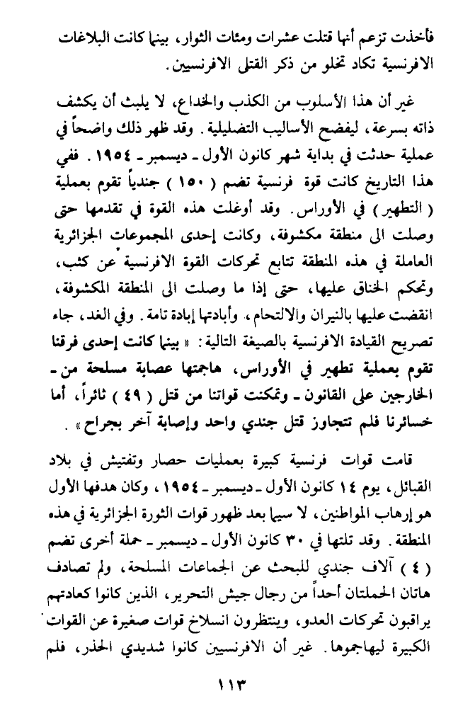 غير أن هذا الأسلوب من الكذب والخداع، لا يلبث أن يكشف ذاته بسرعة، ليفضح الأساليب التضليلية. وقد ظهر ذلك واضحا في عملية حدثت في بداية شهر كانون الأول - ديسمبر - 1954. ففي هذا التاريخ كانت قوة فرنسية تضم (150) جنديا تقوم بعملية (التطهير) في الأوراس. وقد أوغلت هذه القوة في تقدمها حتى وصلت الى منطقة مكشوفة، وكانت إحدى المجموعات الجزائرية العاملة في هذه المنطقة تتابع تحركات القوة الافرنسية عن كثب، وتحكم الخناق عليها، حتى إذا ما وصلت الى المنطقة المكشوفة، انقضت عليها بالنيران والالتحام، وأبادتها إبادة تامة. وفي الغد، جاء تصريح القيادة الافرنسية بالصيغة التالية: (بينما كانت إحدى فرقنا تقوم بعملية تطهير في الأوراس، هاجمتها عصابة مسلحة من - الخارجين على القانون - وتمكنت قواتنا من قتل (49) ثائرا، أما خسائرنا فلم تتجاوز قتل جندي واحد وإصابة آخر بجراح).
