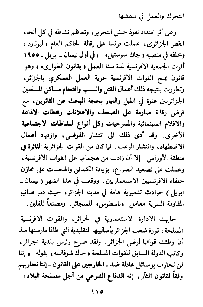 وعلى أثر امتداد نفوذ جيش التحرير، وتعاظم نشاطه في كل أنحاء القطر الجزائري، عملت فرنسا على إقالة الحاكم العام (ليونارد) وخلفه في منصبه (جاك سوستيل). وفي أول نيسان - أبريل - 1950 أقرت الجمعية الافرنسية لمدة سنة العمل (بقانون الطوارىء) وهو قانون يمنح القوات الافرنسية حرية العمل العسكري بالجزائر، وتطورت بنتيجة ذلك أعمال القتل والسلب واقتحام مساكن المسلمين الجزائريين عنوة في الليل والنهار بحجة البحث من الثائرين، مع فرض رقابة صارمة على الصحف والاعلانات ومحطات الاذاعة والافلام السينمائية والمسرحيات وكل أنواع النشاطات الاجتماعية الأخرى. وقد أدى ذلك الى انتشار الفوضى، وازدياد أعمال الاضطهاد، وانتشار الرعب. فما كان من القوات الجزائرية الثائرة في منطقة الأوراس. إلا أن زادت من هجماتها على القوات الافرنسية، وعملت على تصعيد الصراع، بزيادة الكمائن والهجمات على مخازن حلفاء الافرنسيين الاستعماريين. ووقعت في هذا الشهر (نيسان - أبريل) حوادث تدميرية هامة في مدينة الجزائر، حيث دمر فدائيو المقاومة السرية معامل (باسطوس) للسجائر، ومصنعا للفلين.