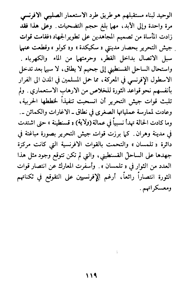 الوحيد لبناء مستقبلهم هو طريق طرد الاستعمار الصليبي الافرنسي مرة واحدة وإلى الأبد، مهما بلغ حجم التضحيات. وعلى هذا فقد زادت المأساة من تصميم المجاهدين على تطوير الجهاد؛ فقامت قوات جيش التحرير بحصار مدينتي (سكيكدة) و (كولو) وقطعت عنهما سبل الاتصال بداخل القطر، وحرمتها من الماء والكهرباء. واستحال الساحل القسنطيني إلى جحيم لا يطاق، لا سيما بعد تدخل الاسطول الإفرنسي في العركة، مما حمل المسلمين في المدن الى الفرار بأنفسهم نحو قواعد الثورة للخلاص من الارهاب الاستعماري. ولم تلبث قوات جيش التحرير أن انسحبت تنفيذا لخططها الحربية، وعادت لممارسة عملياتها الصغرى في نطاق - الاغارات والكمائن -. وما كادت الحالة تهدء نسبيا في عمالة (ولاية) (قسنطينة) حتى اشتدت في مدينة وهران. كما برزت قوات جيش التحرير بصورة مباغتة في دائرة (تلمسان) والتحمت بالقوات الافرنسية التي كانت مركزة جهدها على الساحل القسنطيني، والتي لم تكن تتوقع وجود مثل هذا العدد من الثوار في (تلمسان). وأسفرت المعارك عن انتصار قوات الثورة انتصارا رائعا، أرغم الافرنسيين على التقوقع في ثكناتهم ومعسكراتهم.