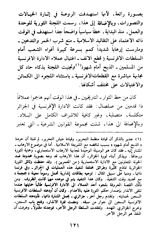 بصورة رائعة، لأنها استهدفت الروعة في إثارة الخيالات والتصورات، وبالإضافة إلى هذا، رسمت اللجنة الثورية للوحدة والعمل، منذ البداية، خطا سياسيا واضحا جدا استهدف في الوقت ذاته الاعتماد على التقاليد الاسلامية - منع شرب الخمر والتدخين -ومارست إرهابا شديدا كمم بسرعة كبيرة أفواه الشعب أمام السلطات الافرنسية (قطع الانف - اغتيال عملاء الادارة الافرنسية من المسلمين - الذبح أمام شهود (¬1) وتجنبت اللجنة بذكاء حاد كل مجابهة مباشرة مع القطعات الافرنسية - باستثناء اللجوء الى الكمائن والاغتيالات على مختلف أشكالها.