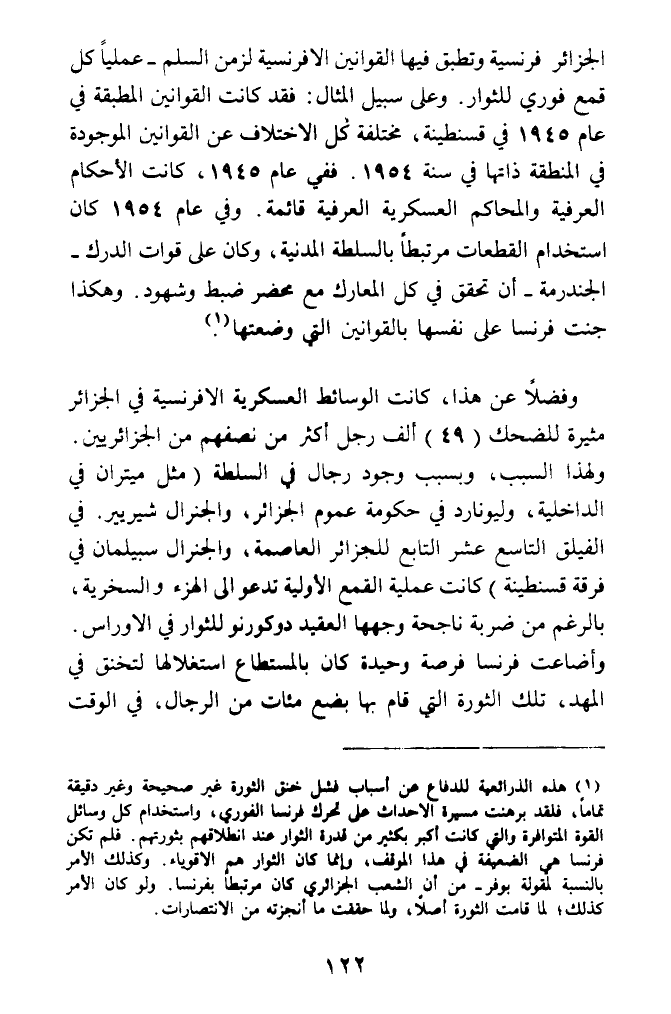 (¬1) هذه الذرائعية للدفاع عن أسباب فشل خنق الثورة غير صحيحة وغير دقيقة تماما، فلقد برهنت مسيرة، الأحداث على تحرك فرنسا الفوري، واستخدام كل وسائل القوة المتوافرة والتي كانت أكبر بكثير من قدرة الثوار عند انطلاقهم بثورتهم. فلم تكن فرنسا هي الضعيفة في هذا الموقف، وإنما كان الثوار هم الأقوياء. وكذلك الأمر بالنسبة لمقولة بوفر - من أن الشعب الجزائري كان مرتبطا بفرنسا. ولو كان الأمر كذلك؛ لما قامت الثورة أصلا، ولما حققت ما أنجزته من الانتصارات.