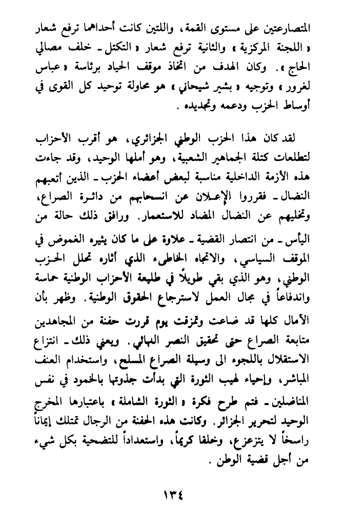لقد كان هذا الحزب الوطني الجزائري، هو أقرب الأحزاب لتطلعات كتلة الجماهير الشعبية، وهو أملها الوحيد، وقد جاءت هذه الأزمة الداخلية مناسبة لبعض أعضاء الحزب - الذين أتعبهم النضال - فقرروا الإعلان عن انسحابهم من دائرة الصراع، وتخليهم عن النضال المضاد للاستعمار. ورافق ذلك حالة من اليأس - من انتصار القضية - علاوة على ما كان يثيره الغموض في الموقف السياسي، والاتجاه الخاطىء الذي أثاره تحلل الحزب الوطني، وهو الذي بقي طويلا في طليعة الأحزاب الوطنية حماسة واندفاعا في مجال العمل لاسترجاع الحقوق الوطنية. وظهر بأن الآمال كلها قد ضاعت وتمزقت يوم قررت حفنة من المجاهدين متابعة الصراع حتى تحقيق النصر النهائي. ويعني ذلك - انتزاع الاستقلال باللجوء إلى وسيلة الصراع المسلح، واستخدام العنف المباشر، وإحياء لهيب الثورة التي بدأت جذوتها بالخمود في نفس المناضلين - فتم طرح فكرة (الثورة الشاملة) باعتبارها المخرج الوحيد لتحرير الجزائر. وكانت هذه الحفنة من الرجال تمتلك إيمانا راسخا لا يتزعزع، وخلقا كريما، واستعدادا للتضحية بكل شيء من أجل قضية الوطن