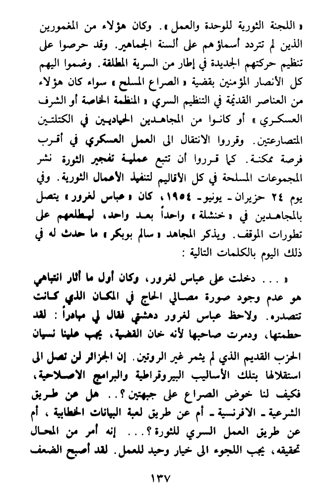 (... دخلت على عباس لغرور، وكان أول ما أثار انتباهي هو عدم وجود صورة مصالي الحاج في المكان الذي كانت تتصدره. ولاحظ عباس لغرور دهشتي فقال لي مبادرا: لقد حطمتها، ودمرت صاحبها لأنه خان القضية، يجب علينا نسيان الحزب القديم الذي لم يثمر غير الروتين. إن الجزائر لن تصل الى استقلالها بتلك الأساليب البيروقراطية والبرامج الاصلاحية، فكيف لنا خوض الصراع على جبهتين؟ .. هل عن طريق الشرعية - الافرنسية - أم عن طريق لعبة البيانات الخطابية، أم عن طريق العمل السري للثورة؟ ... إنه أمر من المحال تحقيقه، يجب اللجوء الى خيار وحيد للعمل. لقد أصبح الضعف