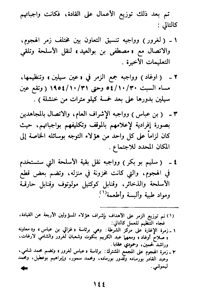 1 - (لغرور) وواجبه تنسيق التعاون بين مختلف زمر الهجوم، والاتصال مع (مصطفى بن بوالعيد) لنقل الأسلحة وتلقي التعليمات الأخيرة.
