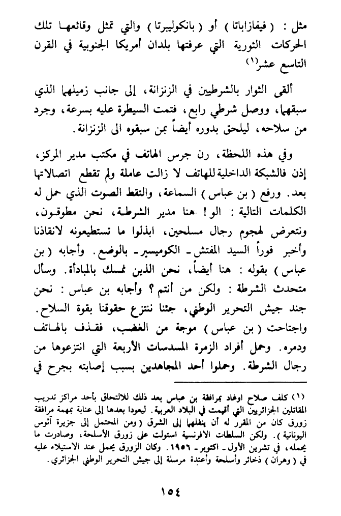 وفي هذه اللحظة، رن جرس الهاتف في مكتب مدير المركز، إذن فالشبكة الداخلية للهاتف لا زالت عاملة ولم تقطع اتصالاتها بعد. ورفع (بن عباس) السماعة، والتقط الصوت الذي حمل له الكلمات التالية الو! هنا مدير الشرطة، نحن مطوقون، ونتعرض لهجوم رجال مسلحين، ابذلوا ما تستطيعونه لانقاذنا وأخبر فورا السيد المفتش - الكوميسير - بالوضع. وأجابه (بن عباس) بقوله: هنا أيضا، نحن الذين نمسك بالمبادأة. وسأل متحدث الشرطة: ولكن من أنتم؟ وأجابه بن عباس: نحن جند جيش التحرير الوطني، جئنا ننتزع حقوقنا بقوة السلاح. واجتاحت (بن عباس) موجة من الغضب، فقذف بالهاتف ودمره. وحمل أفراد الزمرة المسدسامت الأربعة التي انتزعوها من رجال الشرطة. وحملوا أحد المجاهدين بسبب إصابته بجرح في