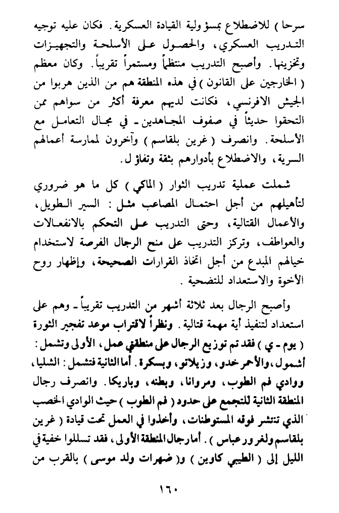سرحا) للاضطلاع بمسؤولية القيادة العسكرية. فكان عليه توجيه التدريب العسكري، والحصول على الأسلحة والتجهيزات وتخزينها. وأصبح التدريب منتظما ومستمرا تقريبا. وكان معظم (الخارجين على القانون) في هذه المنطقة هم من الذين هربوا من الجيش الافرنسي، فكانت لديهم معرفة أكثر من سواهم ممن التحقوا حديثا في صفوف المجاهدين - في مجال التعامل مع الأسلحة. وانصرف (غرين بلقاسم) وآخرون لممارسة أعمالهم السرية، والاضطلاع بأدوارهم بثقة وتفاؤل.