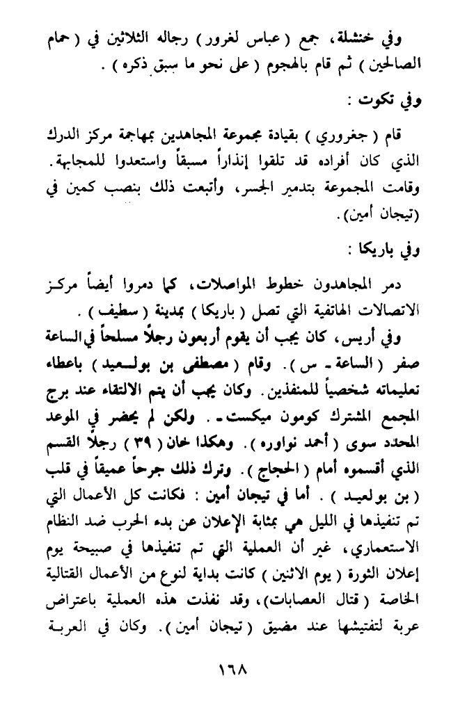 دمر المجاهدون خطوط المواصلات، كما دمروا أيضا مركز الاتصالات الهاتفية التي تصل (باريكا) بمدينة (سطيف). وفي أريس، كان يجب أن يقوم أربعون رجلا مسلحا في الساعة صفر (الساعة - س). وقام (مصطفى بن بولعيد) بإعطاء تعليماته شخصيا للمنفذين. وكان يجب أن يتم الالتقاء عند برج المجمع المشترك كومون ميكست -. ولكن لم يحضر في الموعد المحدد سوى (أحمد نواوره). وهكذا خان (39) رجلا القسم الذي أقسموه أمام (الحجاج). وترك ذلك جرحا عميقا في قلب (بن بولعيد). أما في تيجان أمين: فكانت كل الاعمال التي تم تنفيذها في الليل هي بمثابة الإعلان عن بدء الحرب ضد النظام الاستعماري، غير أن العملية التي تم تنفيذها في صجبيحة يوم إعلان الثورة (يوم الاثنين) كانت بداية لنوع من الأعمال القتالية الخاصة (قتال العصابات)، وقد نفذت هذه العملية باعتراض عربة لتفتيشها عند مضيق (تيجان أمين). وكان في العربة