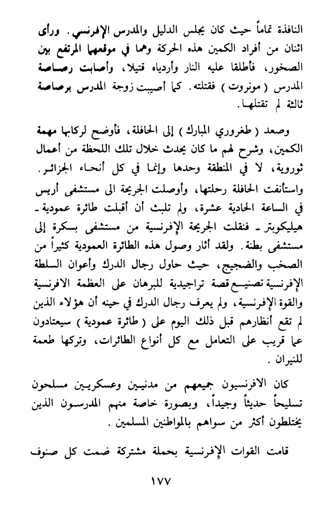 وصعد (طغروري المبارك) إلى الحافلة، فأوضح لركابها مهمة الكمين، وشرح لهم ما كان يحدث خلال تلك اللحظة من أعمال ثوروية، لا في المنطقة وحدها وإنما في كل أنحاء الجزائر. واستأنفت الحافلة رحلتها، وأوصلت الجريحة الى مستشفى أريس في الساعة الحادية عشرة، ولم تلبث أن أقبلت طائرة عمودية - هيليكوبتر - فنقلت الجريحة الافرنسية من مستشفى بسكرة إلى مستشفى بطنة. ولقد أثار وصول هذه الطائرة العمودية كثيرا من الصخب والضجيج، حيث حاول رجال الدرك وأعوان السلطة الإفرنسية تصنيع قصة تراجيدية للبرهان على العظمة الافرنسية والقوة الإفرنسية، ولم يعرف رجال الدرك في حينه أن هؤلاء الذين لم تقع أنظارهم قبل ذلك اليوم على (طائرة عمودية) سيعتادون عما قريب على التعامل مع كل أنواع الطائرات، وتركها طعمة للنيران.