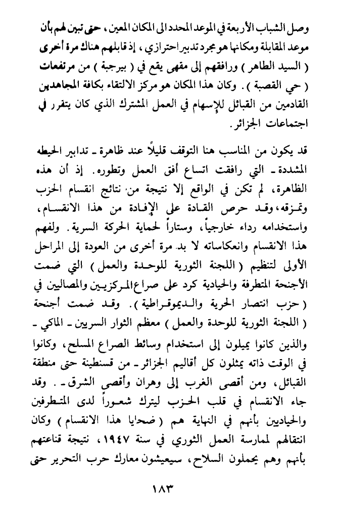 قد يكون من المناسب هنا التوقف قليلا عند ظاهرة - تدابير الحيطه المشددة - التي رافقت اتساع أفق العمل وتطوره. إذ أن هذه الظاهرة، لم تكن في الواقع إلا نتيجة من نتائج انقسام الحزب وتمزقه، وقد حرص القادة على الإفادة من هذا الانقسام، واستخدامه رداء خارجيا، وستارا لحماية الحركة السرية. ولفهم هذا الانقسام وانعكاساته لا بد مرة أخرى من العودة إلى المراحل الأولى لتنظيم (اللجة الثورية للوحدة والعمل) التي ضمت الأجنحة المتطرفة والحيادية كرد على صراع المركزيين والمصاليين في (حزب انتصار الحرية والديمرقراطية). وقد ضمت أجنحة (اللجنة الثورية للوحدة والعمل) معظم الثوار السريين - الماكي - والذين كانوا يميلون إلى استخدام وسائط الصراع المسلح، وكانوا في الوقت ذاته يمثلون كل أقاليم الجزائر - من قسنطينة حتى منطقة القبائل، ومن أقصى الغرب إلى وهران وأقصى الشرق -. وقد جاء الانقسام في قلب الحزب ليترك شعورا لدى المتطرفين والحياديين بأنهم في النهاية هم (ضحايا هذا الانقسام) وكان انتقالهم لممارسة العمل الثوري في سنة 1947، نتيجة قناعتهم بأنهم وهم يحملون السلاح، سيعيشون معارك حرب التحرير حتى