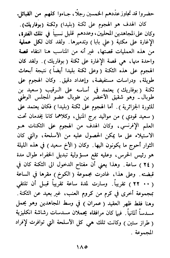 كان الهدف هو الهجوم على ثكنة (بليدا) وثكنة (بوفاريك) , وكان على المجاهدين المحليين، وعددهم قليل نسبيا في تلك الفترة، الإغارة على مكتبة (علي بابا) وتدميرها. ولقد كان لكل عملية من هذه العمليات قصتها، غير أنه من المناسب هنا انتقاء قصة واحدة منها، هي قصة الإغارة على ثكنة (بوفاريك). ولقد كان الهجوم على هذه الثكنة (وعلى ثكنة بليدا أيضا) نتيجة أبحاث طويلة، ودراسات مستفيضة، وإعداد دقيق. وكان الهجوم على ثكنة (بوفاريك) يعتمد في أساسه على الرقيب (سعيد بن طوبال - وهو شقيق الأخضر بن طوبال عضو المجلس الوطني للثورة الجزائرية). أما الهجوم على ثكنة (بليدا) فكان يعتمد على (سعيد قودي) من مواليد برج المنايل، وكلاهما كانا يخدمان تحت العلم الإفرنسي، وكان الهدف من الهجوم على الثكنات هو الاستيلاء على ما يمكن الحصول عليه من الأسلحة، والتي كان الثوار أحوج ما يكونون إليها. وكان (الأخ سعيد) في هذه الليلة هو رئيس الحرس، وعليه تقع مسؤولية تبديل الخفراء طوال مدة (24) ساعة. وهذا يعني أن مفتاح الدخول الى الثكنة كان في قبضته. وعلى هذا، غادرت مجموعة (الكوخ) مقرها في الساعة (00، 22) تقريبا. وسارت لمدة ساعة تقريبا قبل أن تلتقي بمجموعة أخرى في كرم من كروم العنب، غير بعيد عن الثكنة. وهنا فقط ظهر العقيد (عمران) في وسط المجاهدين وهو يحمل مسدسا ألمانيا. فيما كان مرافقاه يحملان مسدسات رشاشة انكليزية (طراز ستين) وكانت تلك هي كل الأسلحة التي توافرت لإفراد المجموعة.