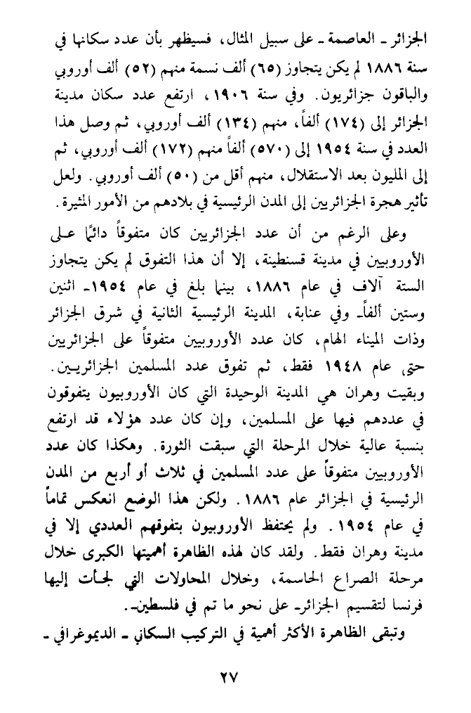 الجزائر - العاصمة - على سبيل المثال، فيظهر بأن عدد سكانها في سنة 1886 لم يكن يتجاوز (65) ألف نسمة منهم (52) ألف أوروبي والباقون جزائريون. وفي سنة 1906، ارتفع عدد سكان مدينة الجزائر إلى (174) ألفا، منهم (134) ألف أوروبي، ثم وصل هذا العدد في سنة 1954 إلى (570) ألفا منهم (172) ألف أوروبي، ثم إلى المليون بعد الاستقلال، منهم أقل من (50) ألف أوروبي. ولعل تأثير هجرة الجزائريين إلى المدن الرئيسية في بلادهم من الأمور المثيرة.