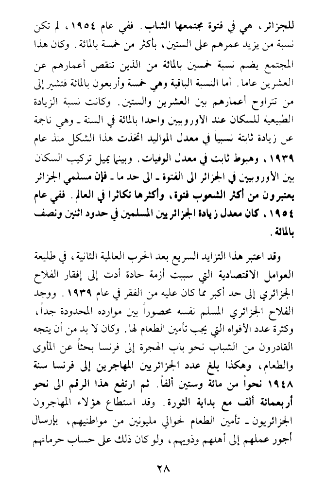 للجزائر، هي في فتوة مجتمعها الشاب. ففي عام 1954، لم تكن نسبة من يزيد عمرهم على الستين، بأكثر من خمسة بالمائة. وكان هذا المجتمع يضم نسبة خمسين بالمائة من الذين تنقص أعمارهم عن العشرين عاما. أما النسبة الباقية وهي خمسة وأربعون بالمائة فتشير إلى من تتراوح أعمارهم بين العشرين والستين. وكانت نسبة الزيادة الطبيعية للسكان عند الأوروبيين واحدا بالمائة في السنة - وهي ناجمة عن زيادة ثابتة نسبيا في معدل المواليد اتخذت هذا الشكل منذ عام 1939، وهبوط ثابت في معدل الوفيات. وبينها يميل تركيب السكان بين الأوربيين في الجزائر إلى الفتوة - إلى حد ما - فإن مسلمي الجزائر يعتبرون من أكثر الشعوب فتوة، وأكثرها تكاثرا في العالم. ففي عام 1954،كان معدل زيادة الجزائريين المسلمين في حدود اثنين ونصف بالمائة.
