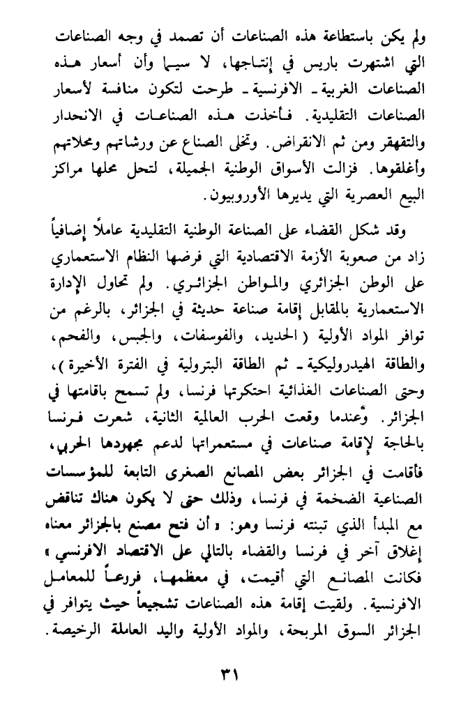 وقد شكل القضاء على الصناعة الوطنية التقليدية عاملا إضافيا زاد من صعوبة الأزمة الاقتصادية التي فرضها النظام الاستعماري على الوطن الجزائري والمواطن الجزائري. ولم تحاول الإدارة الاستعمارية بالمقابل إقامة صناعة حديثة في الجزائر، بالرغم من توافر المواد الأولية (الحديد، والفوسفات، والجبس، والفحم، والطاقة الهيدروليكية - ثم الطاقة البترولية في الفترة الأخيرة)، وحتى الصناعات الغذائية احتكرتها فرنسا، ولم تسمح بإقامتها في الجزائر. وعندما وقعت الحرب العالمية الثانية، شعرت فرنسا بالحاجة لإقامة صناعات في مستعمراتها لدعم مجهودها الحربي، فأقامت في الجزائر بعض المصانع الصغرى التابعة للمؤسسات الصناعية الضخمة في فرنسا، وذلك حتى لا يكون هناك تناقض مع المبدأ الذي تبنته فرنسا وهو: (أن فتح مصنع بالجزائر معناه إغلاق آخر في فرنسا والقضاء بالتالي على الاقتصاد الافرنسي) فكانت المصانع التي أقيمت، في معظمها، فروعا للمعامل الافرنسية. ولقيت إقامة هذه الصناعات تشجيعا حيث يتوافر في الجزائر السوق المربحة، والمواد الأولية واليد العاملة الرخيصة.