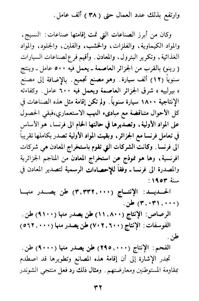 وكان من أبرز الصناعات التي تمت إقامتها صناعات: النسيج، والمواد الكيماوية، والفلزات، والخشب، والفلين، والجلود، والمواد الغذائية، وتكرير البترول، والمعادن. وأقيم فرع لصناعات السيارات (رينو) بالقرب من الجزائر العاصمة - يعمل فيه 500 عامل - وينتج سنويا (12) ألف سيارة. وهو مصنع تجميع. بالإضافة إلى مصنع (بيرلييه) شرق الجزائر العاصمة ويعمل فيه 600 عامل. وكفاءته الإنتاجية 1800 سيارة سنويا. ولم تكن إقامة مثل هذه الصناعات في كل الأحوال متناقضة مع مبادىء النهب الاستعماري، فبقي الحصول على المواد الأولية، وتصديرها في حالتها الخام إلى فرنسا، هو الأساس في تعامل فرنسا مع الجزائر، وبقيت المواد الأولية تصدر بكاملها تقريبا إلى فرنسا. وكانت الشركات التي تقوم باستخراج المعادن هي شركات إفرنسية، وها هو نموذج عن استخراج المعادن من المناجم الجزائرية والمصدرة الى فرنسا - وفقا للإحصاءات الرسمية لتصدير المعادن في سنة 1953: