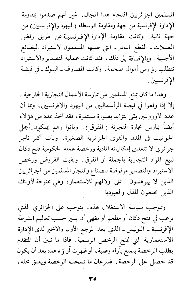 جهة ثانية. وكانت مقاومة الإدارة الإفرنسية عن طريق رفض العملات - القطع النادر- التي طلبها المسلمون لاستيراد البضائع الأجنبية. وبالإضافة إلى ذلك، فقد كانت عملية التصدير والاستيراد تتطلب رؤوس أموال ضخمة، وكانت المصارف - البنوك - في قبضة الإفرنسيين.
