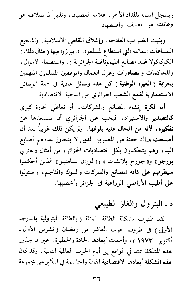 وبقيت الضرائب الفادحة، وإغلاق المقاهي الإسلامية، وتشجيع الصناعات المماثلة التي استطاع المسلمون أن يبرزوا فيها (مثال ذلك: الكوكاكولا ضد مصانع الليموناضة الجزائرية). واستصفاء الأموال، والمحاكمات والمصادرات وعزل العمال والموظفين المسلمين المتهمين بجريمة (الغيرة الوطنية) كل هذه وسائل عادية في جملة الوسائل الاستعمارية لقمع الشعب الجزائري من الناحية الاقتصادية.