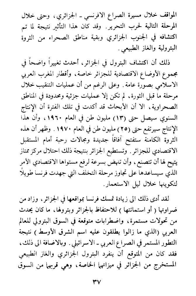 ذلك أن اكتشاف البترول في الجزائر، أحدث تغييرا واضحا في مجموع الأوضاع الاقتصادية للجزائر خاصة، وأقطار المغرب العربي الإسلامي بصورة عامة. وعلى الرغم من أن عمليات التنقيب خلال مرحلة ما قبل الثورة، لم تكن إلا عمليات جزئية ومحدودة في المناطق الصحراوية، الا أن الأبحاث قد أكدت في تلك الفترة أن الإنتاج السنوي سيصل حتى (13) مليون طن في العام 1960، وأن هذا الإنتاج سيرتفع حتى (25) مليون طن في العام 1970. وظهر أن هذه الثروة الكامنة ستفتح آفاقا جديدة ومجالات رحبة أمام المستقبل الاقتصادي للجزائر. وتستطيع الجزائر بنتيجة ذلك احتلال مركز ممتاز يتيح لها أن تتصنع، وأن تنهض بسرعة لرفع مستواها الاقتصادي الأمر الذي سيساعدها على تجاوز مرحلة التخلف التي جهدت فرنسا طويلا لتكوينها خلال ليل الاستعمار.