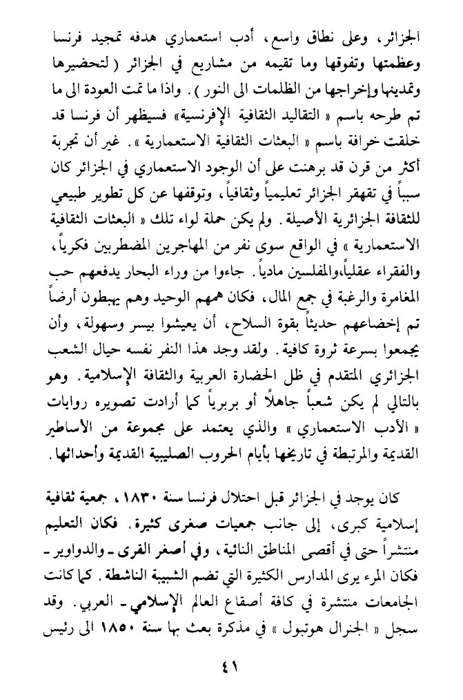 الجزائر، وعلى نطاق واسع، أدب استعماري هدفه تمجيد فرنسا وعظمتها وتفوقها وما تقيمه من مشاريع في الجزائر (لتحضيرها وتمدينها وإخراجها من الظلمات الى النور). واذا ما تمت العودة الى ما تم طرحه باسم (التقاليد الثقافية الإفرنسية) فسيظهر أن فرنسا قد خلقت خرافة باسم (البعثات الثقافية الاستعمارية). غير أن تجربة أكثر من قرن قد برهنت على أن الوجود الاستعماري في الجزائر كان سببا في تقهقر الجزائر تعليميا وثقافيا، وتوقفها عن كل تطوير طبيعي للثقافة الجزائرية الأصيلة. ولم يكن حملة لواء تلك (البعثات الثقافية الاستعمارية) في الواقع سوى نفر من المهاجرين المضطربين فكريا، والفقراء عقليا، والمفلسين ماديا. جاءوا من وراء البحار يدفعهم حب المغامرة والرغبة في جمع المال، فكان همهم الوحيد وهم يهبطون أرضا تم إخضاعهم حديثا بقوة السلاح، أن يعيشوا بيسر وسهولة، وأن يجمعوا بسرعة ثروة كافية. ولقد وجد هذا النفر نفسه حيال الشعب الجزائري المتقدم في ظل الحضارة العربية والثقافة الإسلامية. وهو بالتالي لم يكن شعبا جاهلا أو بربريا كما أرادت تصويره روايات (الأدب الاستعماري) والذي يعتمد على مجموعة من الأساطير القديمة والمرتبطة في تاريخها بأيام الحروب الصليبية القديمة وأحداثها.