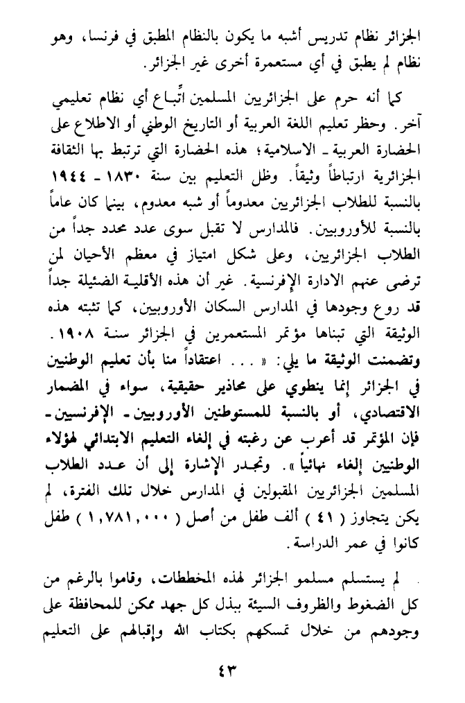 كما أنه حرم على الجزائريين المسلمين اتباع أي نظام تعليمي آخر. وحظر تعليم اللغة العربية أو التاريخ الوطني أو الاطلاع على الحضارة العربية - الاسلامية؛ هذه الحضارة التي ترتبط بها الثقافة الجزائرية ارتباطا وثيقا. وظل التعليم بين سنة 1830 - 1944 بالنسبة للطلاب الجزائريين معدوما أو شبه معدوم، بينما كان عاما بالنسبة للأوروبيين. فالمدارس لا تقبل سوى عدد محدد جدا من الطلاب الجزائريين، وعلى شكل امتياز في معظم الأحيان لمن ترضى عنهم الادارة الإفرنسية. غير أن هذه الأقلية الضئيلة جدا قد روع وجودها في المدارس السكان الأوروبيين، كما تثبته هذه الوثيقة التي تبناها مؤتمر المستعمرين في الجزائر سنة 1908. وتضمنت الوثيقة ما يلي: (... اعتقادا منا بأن تعليم الوطنيين في الجزائر إنما ينطوي على محاذير حقيقية، سواء في المضمار الاقتصادي، أو بالنسبة للمستوطنين الأوروبيين - الافرنسيين -فإن المؤتمر قد أعرب عن رغبته في إلغاء التعليم الابتدائي لهؤلاء الوطنيين إلغاء نهائيا). وتجدر الإشارة إلى أن عدد الطلاب المسلمين الجزائريين المقبولين في المدارس خلال تلك الفترة، لم يكن يتجاوز (41) ألف طفل من اصل (1،781،000) طفل كانوا في عمر الدراسة.
